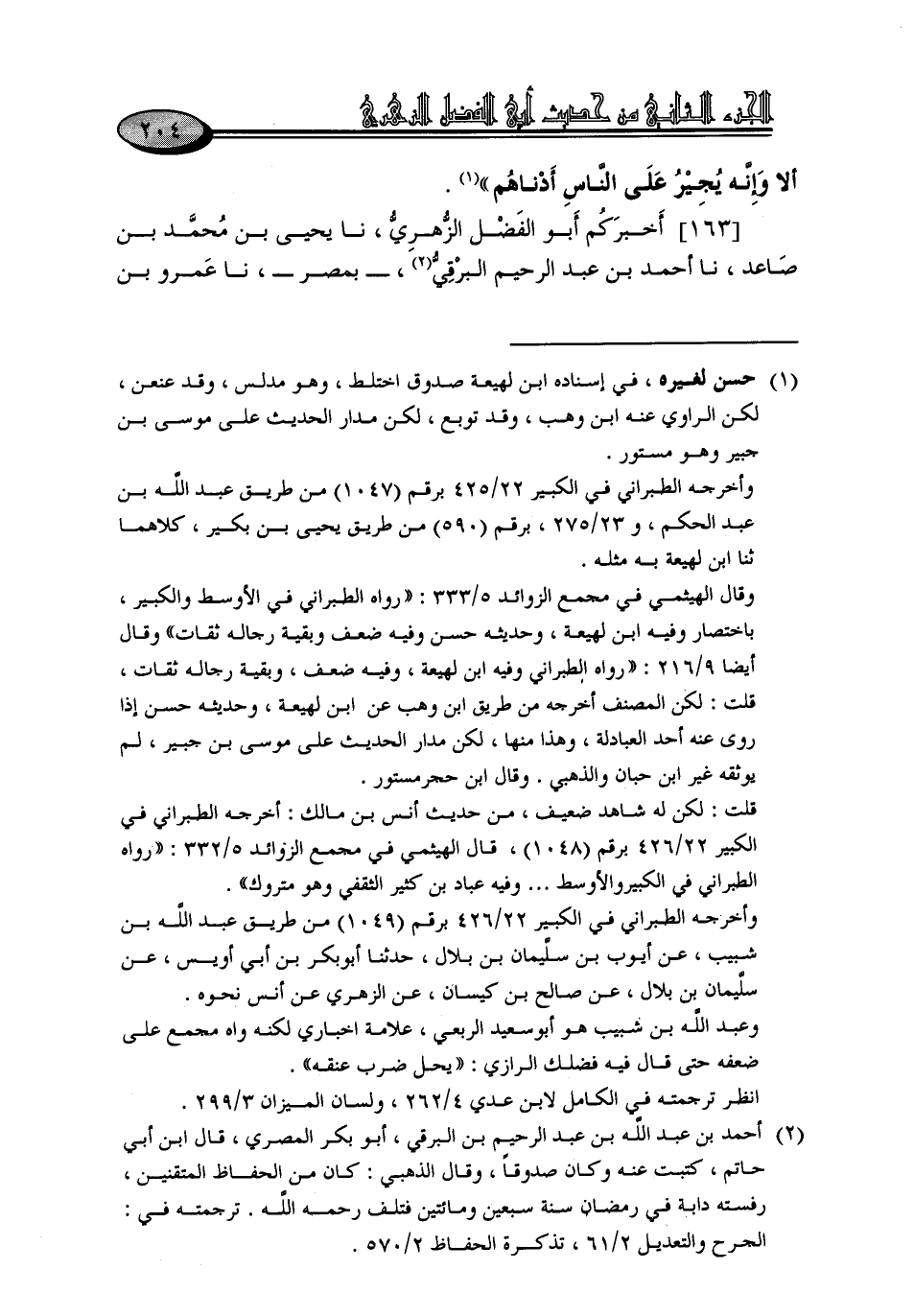 163 - أَخْبَرَكُمْ أَبُو الْفَضْلِ الزُّهْرِيُّ، نا يَحْيَى بْنُ مُحَمَّدِ بْنِ صَاعِدٍ، نا أَحْمَدُ بْنُ عَبْدِ الرَّحِيمِ الْبَرْقِيُّ، بِمِصْرَ، نا عَمْرُو بْنُ -[205]- أَبِي سَلَمَةَ، نا صَدَقَةُ بْنُ عَبْدِ اللَّهِ، عَنِ النُّعْمَانِ بْنِ الْمُنْذِرِ، عَنْ عَبْدَةَ بْنِ أَبِي لُبَابَةَ، قَالَ: حَدَّثَنِي وَرَّادٌ مَوْلَى الْمُغِيرَةِ أَنَّ النَّبِيَّ صَلَّى اللَّهُ عَلَيْهِ وَسَلَّمَ كَانَ إِذَا سَلَّمَ مِنْ صَلَاتِهِ، يَقُولُ قَبْلَ أَنْ يَقُومَ وَقَبْلَ أَنْ يَتَكَلَّمَ: «لَا إِلَهَ إِلَّا اللَّهُ، وَحْدَهُ لَا شَرِيكَ لَهُ، لَهُ الْمُلْكُ وَلَهُ الْحَمْدُ، اللَّهُمَّ لَا مَانِعَ لِمَا أَعْطَيْتَ، وَلَا مُعْطِيَ لِمَا مَنَعْتَ، وَلَا يَنْفَعُ ذَا الْجَدِّ مِنْكَ الْجَدُّ»