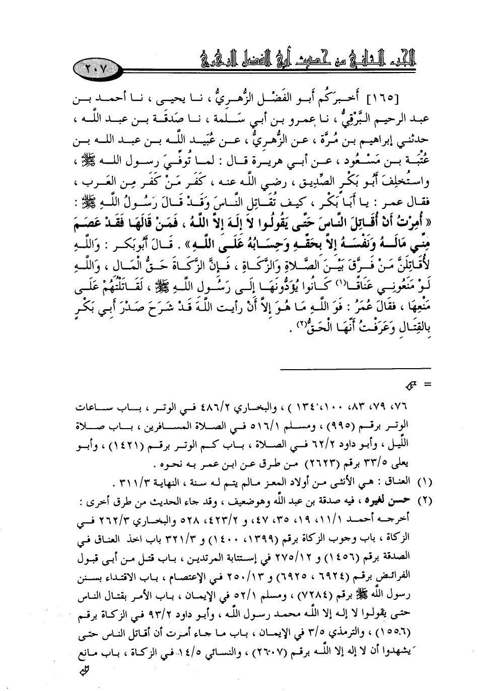 165 - أَخْبَرَكُمْ أَبُو الْفَضْلِ الزُّهْرِيُّ، نا يَحْيَى، نا أَحْمَدُ بْنُ عَبْدِ الرَّحِيمِ الْبَرْقِيُّ، نا عَمْرُو بْنُ أَبِي سَلَمَةَ، نا صَدَقَةُ بْنُ عَبْدِ اللَّهِ، حَدَّثَنِي إِبْرَاهِيمُ بْنُ مُرَّةَ، عَنِ الزُّهْرِيِّ، عَنْ عُبَيْدِ اللَّهِ بْنِ عَبْدِ اللَّهِ بْنِ عُتْبَةَ بْنِ مَسْعُودٍ، عَنْ أَبِي هُرَيْرَةَ، قَالَ: لَمَّا تُوُفِّيَ رَسُولُ اللَّهِ صَلَّى اللَّهُ عَلَيْهِ وَسَلَّمَ، وَاسْتُخْلِفَ أَبُو بَكْرٍ الصِّدِّيقُ، رَضِيَ اللَّهُ عَنْهُ، كَفَرَ مَنْ كَفَرَ مِنَ الْعَرَبِ، فَقَالَ عُمَرُ: يَا أَبَا بَكْرٍ، كَيْفَ تُقَاتِلُ النَّاسَ , وَقَدْ قَالَ رَسُولُ اللَّهِ صَلَّى اللَّهُ عَلَيْهِ وَسَلَّمَ: «أُمِرْتُ أَنْ أُقَاتِلَ النَّاسَ حَتَّى يَقُولُوا لَا إِلَهَ إِلَّا اللَّهُ، فَمَنْ قَالَهَا فَقَدْ عَصَمَ مِنِّي مَالَهُ وَنَفْسَهُ إِلَّا بِحَقِّهِ , وَحِسَابُهُ عَلَى اللَّهِ». قَالَ أَبُو بَكْرٍ: وَاللَّهِ لَأُقَاتِلَنَّ مَنْ فَرَّقَ بَيْنَ الصَّلَاةِ وَالزَّكَاةِ، فَإِنَّ الزَّكَاةَ حَقُّ الْمَالِ، وَاللَّهِ لَوْ مَنَعُونِي عَنَاقًا كَانُوا يُؤَدُّونَهَا إِلَى رَسُولِ اللَّهِ صَلَّى اللَّهُ عَلَيْهِ وَسَلَّمَ، لَقَاتَلْتُهُمْ عَلَى مَنْعِهَا , فَقَالَ عُمَرُ: فَوَاللَّهِ , مَا هُوَ إِلَّا أَنْ رَأَيْتُ اللَّهَ قَدْ شَرَحَ صَدْرَ أَبِي بَكْرٍ بِالْقِتَالِ وَعَرَفْتُ أَنَّهَا الْحَقُّ. -[208]- قَالَ ابْنُ صَاعِدٍ: وَعِنْدَهُ حَدِيثُ سَعِيدِ بْنِ الْمُسَيَّبِ.