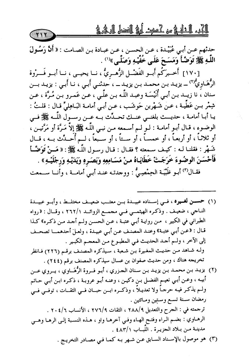 170 - أَخْبَرَكُمْ أَبُو الْفَضْلِ الزُّهْرِيُّ، نا يَحْيَى، نا أَبُو فَرْوَةَ الرَّهَاوِيُّ يَزِيدُ بْنُ مُحَمَّدِ بْنِ يَزِيدَ - حَدَّثَنِي أَبِي، نا أَبِي يَزِيدُ بْنُ سِنَانٍ، نا زَيْدُ بْنُ أَبِي أُنَيْسَةَ، وَعَبْدُ اللَّهِ بْنُ عَلِيٍّ، عَنْ عَمْرِو بْنِ مُرَّةَ، عَنْ شِمْرِ بْنِ عَطِيَّةَ، عَنْ شَهْرِ بْنِ حَوْشَبٍ، عَنْ أَبِي أُمَامَةَ الْبَاهِلِيِّ، قَالَ: قُلْتُ: يَا أَبَا أُمَامَةَ حَدِيثٌ بَلَغَنِي عَنْكَ تُحَدِّثُ بِهِ عَنْ رَسُولِ اللَّهِ صَلَّى اللَّهُ عَلَيْهِ وَسَلَّمَ فِي الْوُضُوءِ، قَالَ أَبُو أُمَامَةَ: لَوْ لَمْ أَسْمَعْهُ مِنْ نَبِيِّ اللَّهِ صَلَّى اللَّهُ عَلَيْهِ وَسَلَّمَ إِلَّا مَرَّةً أَوْ مَرَّتَيْنِ، أَوْ ثَلَاثًا، أَوْ أَرْبَعًا، أَوْ خَمْسًا، أَوْ سِتًّا، أَوْ سَبْعًا، لَمْ أُحَدِّثْ بِهِ، قَالَ شَهْرٌ: فَقُلْنَا لَهُ: كَيْفَ سَمِعْتَهُ؟ فَقَالَ: قَالَ رَسُولُ اللَّهِ صَلَّى اللَّهُ عَلَيْهِ وَسَلَّمَ: «مَنْ تَوَضَّأَ , فَأَحْسَنَ الْوُضُوءَ خَرَجَتْ خَطَايَاهُ مِنْ مَسَامِعِهِ وَبَصَرِهِ وَيَدَيْهِ وَرِجْلَيْهِ» فَقَالَ أَبُو ظَبْيَةَ الْحِمْصِيُّ: وَوَجَدْتُهُ عِنْدَ أَبِي أُمَامَةَ، وَأَنَا سَمِعْتُ -[213]- عَمْرَو بْنَ عَبَسَةَ يُحَدِّثُ بِذَلِكَ عَنْ رَسُولِ اللَّهِ صَلَّى اللَّهُ عَلَيْهِ وَسَلَّمَ وَيَقُولُ: «مَا مِنْ عَبْدٍ يَبِيتُ عَلَى طُهْرٍ , فَيَذْكُرُ اللَّهَ تَعَالَى , ثُمَّ يَتَعَارَّ مِنَ اللَّيْلِ , فَيَدْعُوا اللَّهَ تَعَالَى إِلَّا أَعْطَاهُ اللَّهُ تَعَالَى مَا سَأَلَ مِنْ أَمْرِ الدُّنْيَا وَالْآخِرَةِ»