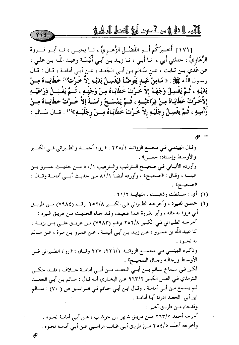 171 - أَخْبَرَكُمْ أَبُو الْفَضْلِ الزُّهْرِيُّ، نا يَحْيَى، نا أَبُو فَرْوَةَ الرَّهَاوِيُّ، حَدَّثَنِي أَبِي، نا أَبِي، نا زَيْدُ بْنُ أَبِي أُنَيْسَةَ، وَعَبْدُ اللَّهِ بْنُ عَلِيٍّ، عَنْ عَدِيِّ بْنِ ثَابِتٍ، عَنْ سَالِمِ بْنِ أَبِي الْجَعْدِ، عَنْ أَبِي أُمَامَةَ، قَالَ: قَالَ رَسُولُ اللَّهِ صَلَّى اللَّهُ عَلَيْهِ وَسَلَّمَ: «مَا مِنْ عَبْدٍ يَتَوَضَّأُ , فَيَغْسِلُ يَدَيْهِ إِلَّا خَرَّتْ خَطَايَاهُ مِنْ يَدَيْهِ، ثُمَّ يَغْسِلُ وَجْهَهُ إِلَّا خَرَّتْ خَطَايَاهُ مِنْ وَجْهِهِ، ثُمَّ يَغْسِلُ ذِرَاعَيْهِ إِلَّا خَرَّتْ خَطَايَاهُ مِنْ ذِرَاعَيْهِ، ثُمَّ يَمْسَحُ رَأْسَهُ إِلَّا خَرَّتْ خَطَايَاهُ مِنْ رَأْسِهِ، ثُمَّ يَغْسِلُ رِجْلَيْهِ إِلَّا خَرَّتْ خَطَايَاهُ مِنْ رِجْلَيْهِ» قَالَ سَالِمٌ: -[215]- فَقُلْتُ: يَا أَبَا أُمَامَةَ، انْظُرْ مَا تَقُولُ، فَإِنَّا قَدْ أَدْرَكْنَا رِجَالًا , فَمَا سَمِعْنَاهُمْ يَقُولُونَ ذَلِكَ. فَقَالَ أَبُو أُمَامَةَ: لَوْ لَمْ أَسْمَعْهُ إِلَّا مَرَّةً أَوْ مَرَّتَيْنِ لَمْ أُحَدِّثْ بِهِ
