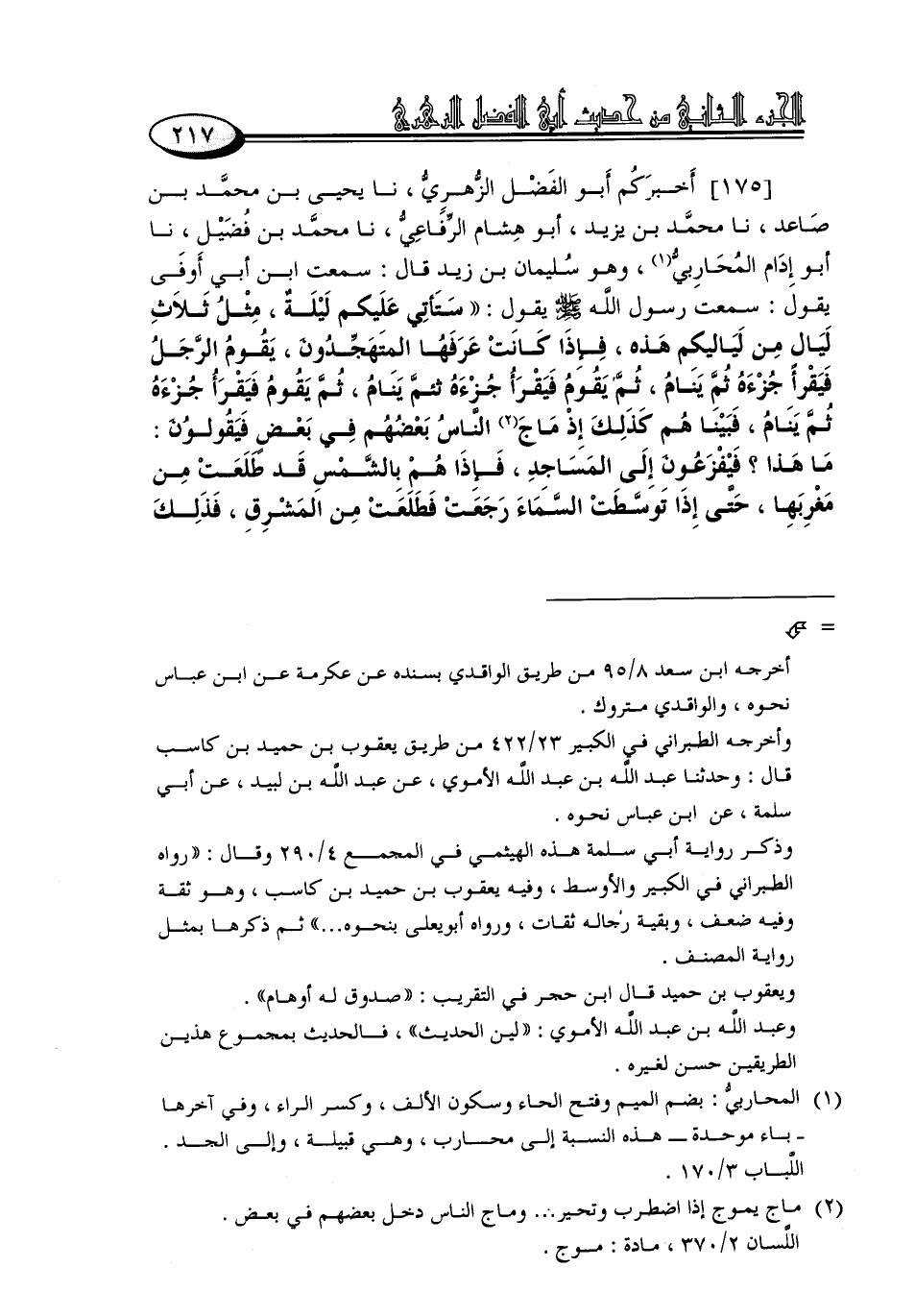 175 - أَخْبَرَكُمْ أَبُو الْفَضْلِ الزُّهْرِيُّ، نا يَحْيَى بْنُ مُحَمَّدِ بْنِ صَاعِدٍ، نا مُحَمَّدُ بْنُ يَزِيدَ أَبُو هَاشِمٍ الرِّفَاعِيُّ، نا مُحَمَّدُ بْنُ فُضَيْلٍ، نا أَبُو إِدَامٍ الْمُحَارِبِيُّ وَهُوَ سُلَيْمَانُ بْنُ زَيْدٍ، قَالَ: سَمِعْتُ ابْنَ أَبِي أَوْفَى، يَقُولُ: سَمِعْتُ رَسُولَ اللَّهِ صَلَّى اللَّهُ عَلَيْهِ وَسَلَّمَ يَقُولُ: " سَتَأْتِي عَلَيْكُمْ لَيْلَةٌ، مِثْلُ ثَلَاثِ لَيَالٍ مِنْ لَيَالِيِّكُمْ هَذِهِ، فَإِذَا كَانَتْ عَرَفَهَا الْمُتَهَجِّدُونَ، يَقُومُ الرَّجُلُ فَيَقْرَأُ جُزْءهُ , ثُمَّ يَنَامُ، ثُمَّ يَقُومُ , فَيَقْرَأُ جُزْءهُ , ثُمَّ يَنَامُ، ثُمَّ يَقُومُ , فَيَقْرَأُ جُزْءهُ , ثُمَّ يَنَامُ، فَبَيْنَا هُمْ كَذَلِكَ إِذْ مَاجَ النَّاسُ بَعْضُهُمْ فِي بَعْضٍ , فَيَقُولُونَ: مَا هَذَا؟ فَيَفْزَعُونَ إِلَى الْمَسَاجِدِ، فَإِذَا هُمْ بِالشَّمْسِ قَدْ طَلَعَتْ مِنْ مَغْرِبِهَا، حَتَّى إِذَا تَوَسَّطَتِ السَّمَاءَ رَجَعَتْ , فَطَلَعَتْ مِنَ الْمَشْرِقِ، فَذَلِكَ -[218]- حِينَ {لَا يَنْفَعُ نَفْسًا إِيمَانُهَا لَمْ تَكُنْ آمَنَتْ مِنْ قَبْلُ} [الأنعام: 158] الْآيَةَ