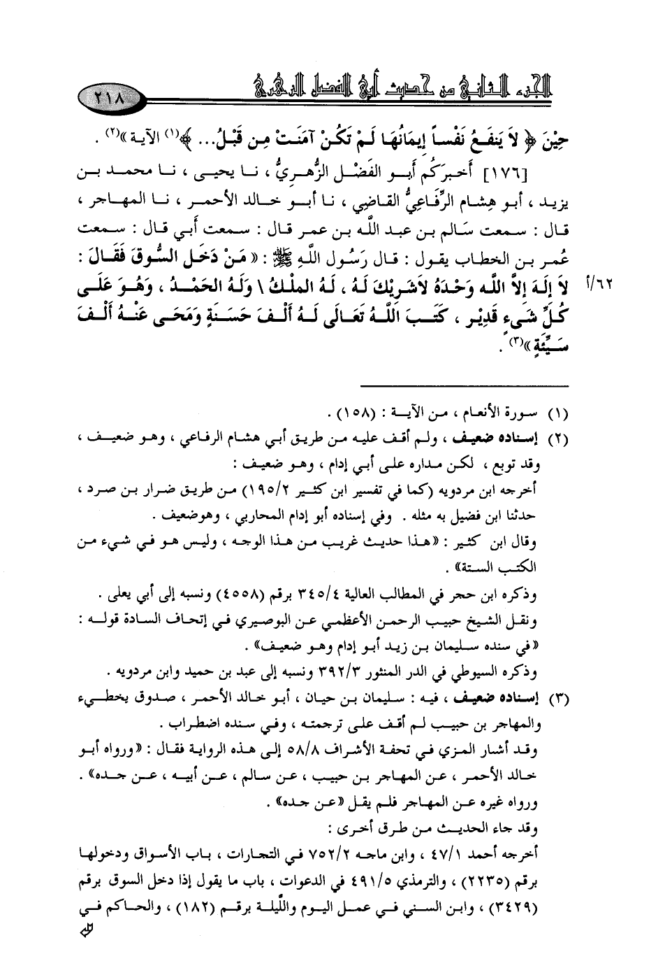 176 - أَخْبَرَكُمْ أَبُو الْفَضْلِ الزُّهْرِيُّ، نا يَحْيَى، نا مُحَمَّدُ بْنُ يَزِيدَ، أَبُو هِشَامٍ الرِّفَاعِيُّ الْقَاضِي، نا أَبُو خَالِدٍ الْأَحْمَرُ، نا الْمُهَاجِرُ، قَالَ: سَمِعْتُ سَالِمَ بْنَ عَبْدِ اللَّهِ بْنِ عُمَرَ، قَالَ: سَمِعْتُ أَبِيَ، قَالَ: سَمِعْتُ عُمَرَ بْنَ الْخَطَّابِ، يَقُولُ: قَالَ رَسُولُ اللَّهِ صَلَّى اللَّهُ عَلَيْهِ وَسَلَّمَ: " مَنْ دَخَلَ السُّوقَ , فَقَالَ: لَا إِلَهَ إِلَّا اللَّهُ وَحْدَهُ لَا شَرِيكَ لَهُ، لَهُ الْمُلْكُ وَلَهُ الْحَمْدُ، وَهُوَ عَلَى كُلِّ شَيْءٍ قَدِيرٌ، كَتَبَ اللَّهُ تَعَالَى لَهُ أَلْفَ حَسَنَةٍ وَمَحَا عَنْهُ أَلْفَ سَيِّئَةٍ "