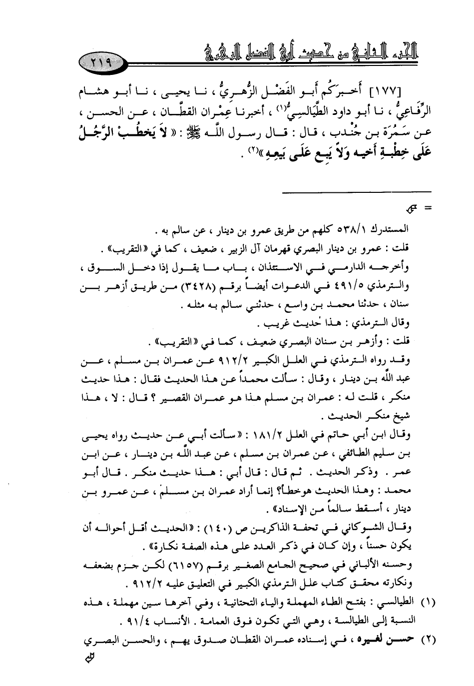 177 - أَخْبَرَكُمْ أَبُو الْفَضْلِ الزُّهْرِيُّ، نا يَحْيَى، نا أَبُو هِشَامٍ الرِّفَاعِيُّ، نا أَبُو دَاوُدَ الطَّيَالِسِيُّ، أَخْبَرَنَا عِمْرَانُ الْقَطَّانُ، عَنِ الْحَسَنِ، عَنْ سَمُرَةَ بْنِ جُنْدُبٍ، قَالَ: قَالَ رَسُولُ اللَّهِ صَلَّى اللَّهُ عَلَيْهِ وَسَلَّمَ: «لَا يَخْطُبُ الرَّجُلُ عَلَى خِطْبَةِ أَخِيهِ , وَلَا يَبِعْ عَلَى بَيْعِهِ» -[220]- قَالَ ابْنُ صَاعِدٍ , وَعِمْرَانُ قَدْ سَمِعَ مِنَ الْحَسَنِ , وَرَوَى عَنْهُ