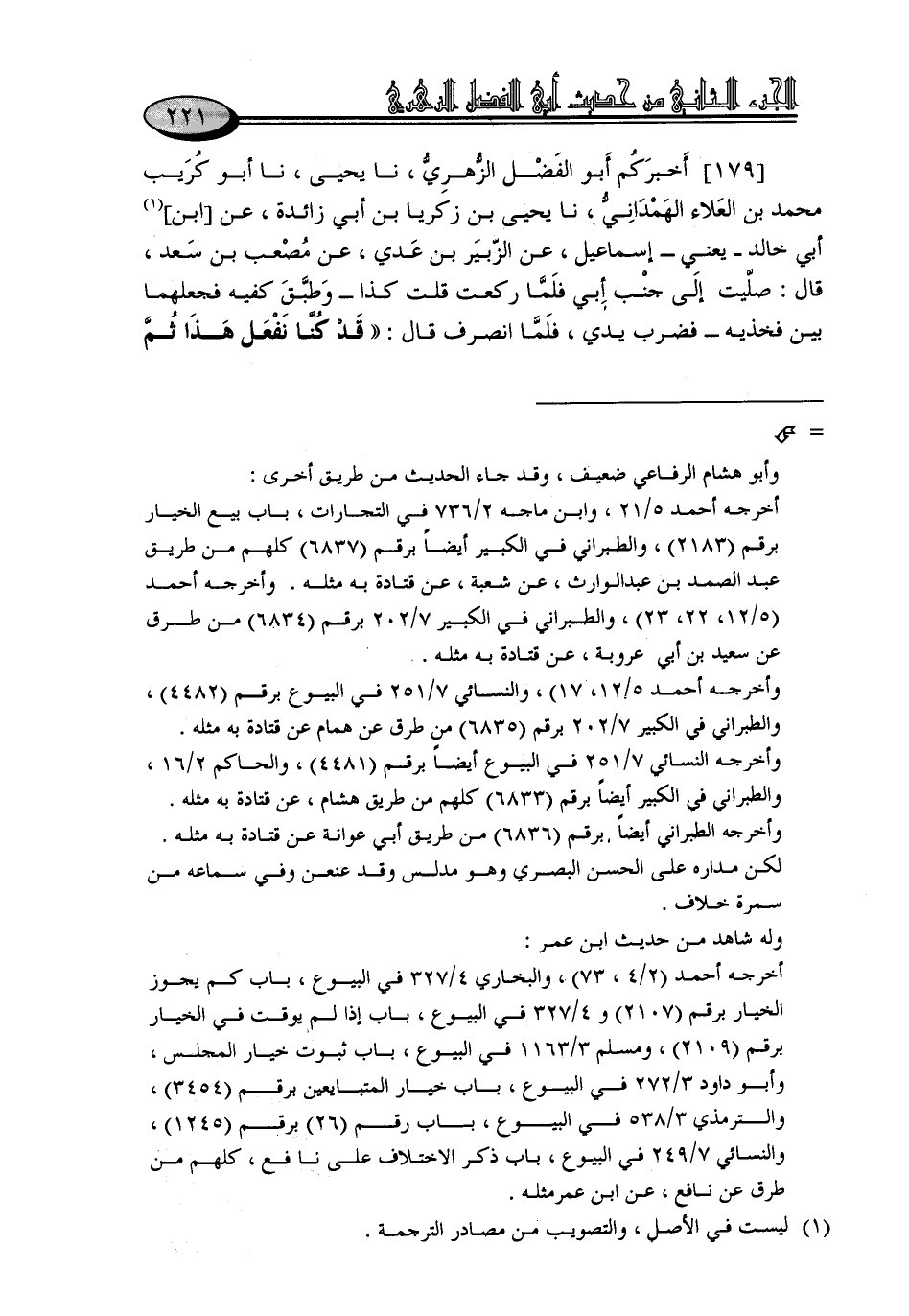 179 - أَخْبَرَكُمْ أَبُو الْفَضْلِ الزُّهْرِيُّ، نا يَحْيَى، نا أَبُو كُرَيْبٍ مُحَمَّدُ بْنُ الْعَلَاءِ الْهَمْدَانِيُّ، نا يَحْيَى بْنُ زَكَرِيَّا بْنِ أَبِي زَائِدَةَ، عَنِ ابْنِ أَبِي خَالِدٍ يَعْنِي إِسْمَاعِيلَ، عَنِ الزُّبَيْرِ بْنِ عَدِيٍّ، عَنْ مُصْعَبِ بْنِ سَعْدٍ، قَالَ: " صَلَّيْتُ إِلَى جَنْبِ أَبِي , فَلَمَّا رَكَعْتُ قُلْتُ كَذَا - وَطَبَّقَ كَفَّيْهِ فَجَعَلَهُمَا بَيْنَ فَخِذَيْهِ - فَضَرَبَ يَدَيَّ، فَلَمَّا انْصَرَفَ قَالَ: «قَدْ كُنَّا نَفْعَلُ هَذَا , ثُمَّ -[222]- أَمَرَنَا اللَّهُ تَعَالَى أَنْ نَرْفَعَ إِلَى الرُّكَبِ»