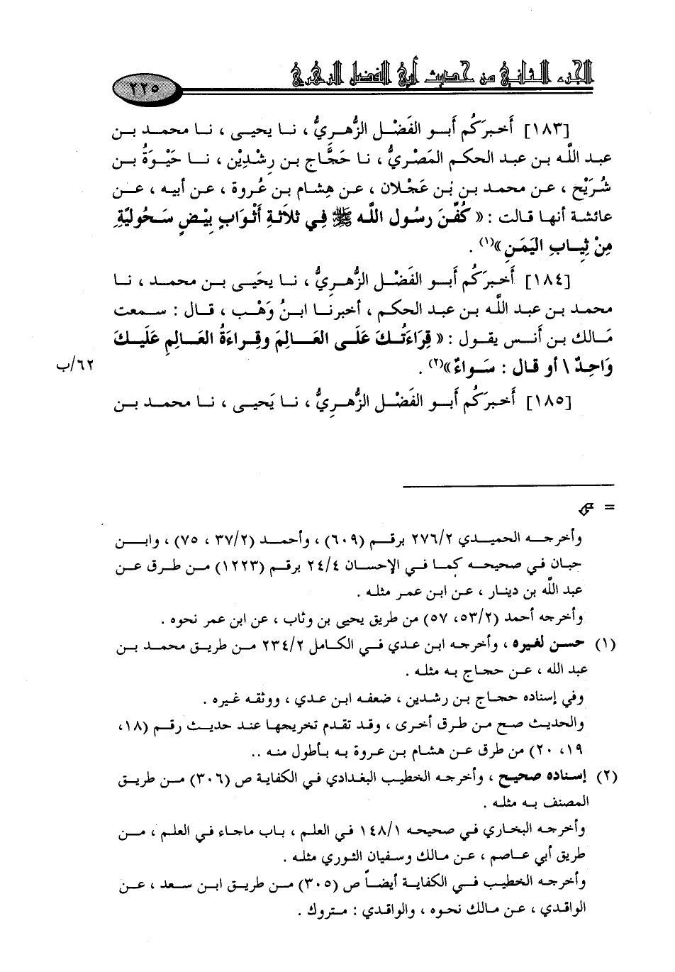 183 - أَخْبَرَكُمْ أَبُو الْفَضْلِ الزُّهْرِيُّ، نا يَحْيَى، نا مُحَمَّدُ بْنُ عَبْدِ اللَّهِ بْنِ عَبْدِ الْحَكَمِ الْمِصْرِيُّ، نا حَجَّاجُ بْنُ رِشْدِينَ، نا حَيْوَةُ بْنُ شُرَيْحٍ، عَنْ مُحَمَّدِ بْنِ عَجْلَانَ، عَنْ هِشَامِ بْنِ عُرْوَةَ، عَنْ أَبِيهِ، عَنْ عَائِشَةَ، أَنَّهَا قَالَتْ: «كُفِّنَ رَسُولُ اللَّهِ صَلَّى اللَّهُ عَلَيْهِ وَسَلَّمَ فِي ثَلَاثَةِ أَثْوَابٍ بِيضٍ سُحُولِيَّةٍ مِنْ ثِيَابِ الْيَمَنِ»