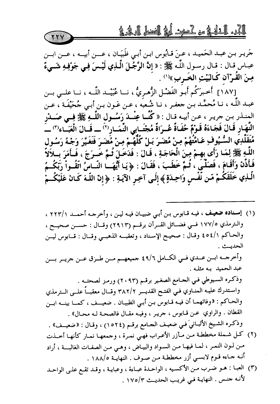 187 - أَخْبَرَكُمْ أَبُو الْفَضْلِ الزُّهْرِيُّ، نا عُبَيْدُ اللَّهِ، نا عَلِيُّ بْنُ عَبْدِ اللَّهِ، نا مُحَمَّدُ بْنُ جَعْفَرٍ، نا شُعْبَةُ، عَنْ عَوْنِ بْنِ أَبِي جُحَيْفَةَ، عَنِ الْمُنْذِرِ بْنِ جَرِيرٍ، عَنْ أَبِيهِ، قَالَ: كُنَّا عِنْدَ رَسُولِ اللَّهِ صَلَّى اللَّهُ عَلَيْهِ وَسَلَّمَ فِي صَدْرِ النَّهَارِ قَالَ: فَجَاءَهُ قَوْمٌ حُفَاةٌ عُرَاةٌ مُجْتَابِي النِّمَارِ - قَالَ: الْعَبَاءَ - مُتَقَلِّدِي السُّيُوفِ , عَامَّتُهُمْ مِنْ مُضَرَ بَلْ كُلُّهُمْ مِنْ مُضَرَ , فَتَغَيَّرَ وَجْهُ رَسُولِ اللَّهِ صَلَّى اللَّهُ عَلَيْهِ وَسَلَّمَ لَمَّا رَأَى بِهِمْ مِنَ الْحَاجَةِ، قَالَ: فَدَخَلَ , ثُمَّ خَرَجَ، فَأَمَرَ بِلَالًا , فَأَذَّنَ وَأَقَامَ، فَصَلَّى، ثُمَّ خَطَبَ، فَقَالَ: {يَا أَيُّهَا النَّاسُ اتَّقُوا رَبَّكُمُ الَّذِي خَلَقَكُمْ مِنْ نَفْسٍ وَاحِدَةٍ} [النساء: 1] إِلَى آخِرِ الْآيَةِ: {إِنَّ اللَّهَ كَانَ عَلَيْكُمْ -[228]- رَقِيبًا} [النساء: 1] , وَقَرَأَ الْآيَةَ الَّتِي فِي الْحَشْرِ: {وَلْتَنْظُرْ نَفْسٌ مَا قَدَّمَتْ لِغَدٍ} [الحشر: 18]، ثُمَّ قَالَ: تَصَدَّقَ رَجُلٌ مِنْ دِينَارِهِ، مِنْ دِرْهَمِهِ، مِنْ ثَوْبِهِ حَتَّى قَالَ: مِنْ صَاعِ بُرِّهِ مِنْ صَاعِ تَمْرِهِ حَتَّى قَالَ: وَلَوْ بِشِقِّ تَمْرَةٍ "
