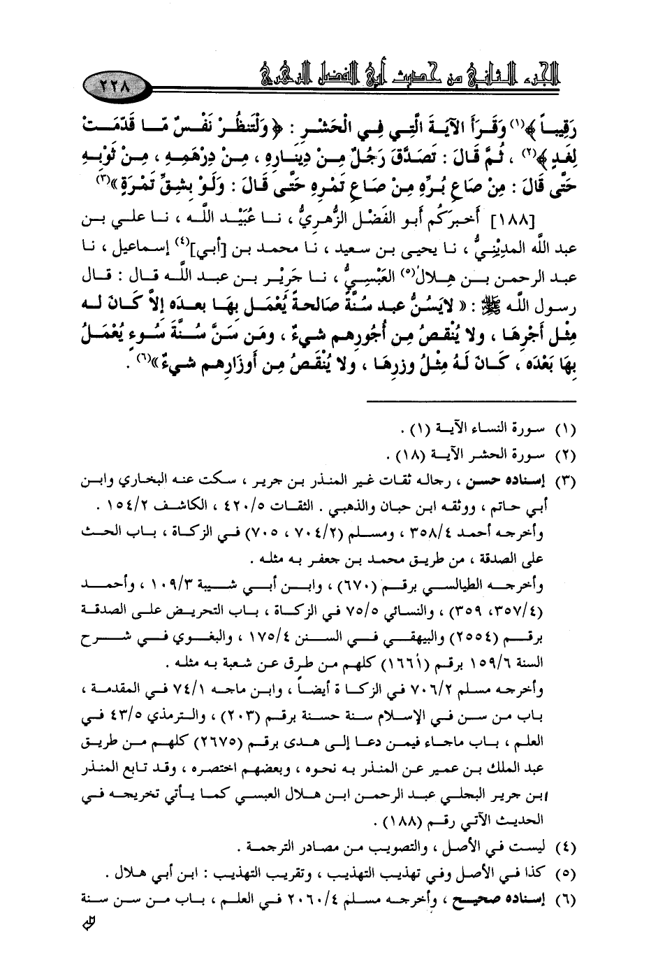 188 - أَخْبَرَكُمْ أَبُو الْفَضْلِ الزُّهْرِيُّ، نا عُبَيْدُ اللَّهِ، نا عَلِيُّ بْنُ عَبْدِ اللَّهِ الْمَدِينِيُّ، نا يَحْيَى بْنُ سَعِيدٍ، نا مُحَمَّدُ بْنُ أَبِي إِسْمَاعِيلَ، نا عَبْدُ الرَّحْمَنِ بْنُ هِلَالٍ الْعَبْسِيُّ، نا جَرِيرُ بْنُ عَبْدِ اللَّهِ، قَالَ: قَالَ رَسُولُ اللَّهِ صَلَّى اللَّهُ عَلَيْهِ وَسَلَّمَ: «لَا يَسُنُّ عَبْدٌ سُنَّةً صَالِحَةً يُعْمَلُ بِهَا بَعْدَهُ إِلَّا كَانَ لَهُ مِثْلُ أَجْرِهَا، وَلَا يَنْقُصُ مِنْ أُجُورِهِمْ شَيْءٌ، وَمَنْ سَنَّ سُنَّةً سُوءً يُعْمَلُ بِهَا بَعْدَهُ، كَانَ لَهُ مِثْلُ وِزْرِهَا، وَلَا يَنْقُصُ مِنْ أَوْزَارِهِمْ شَيْءٌ»