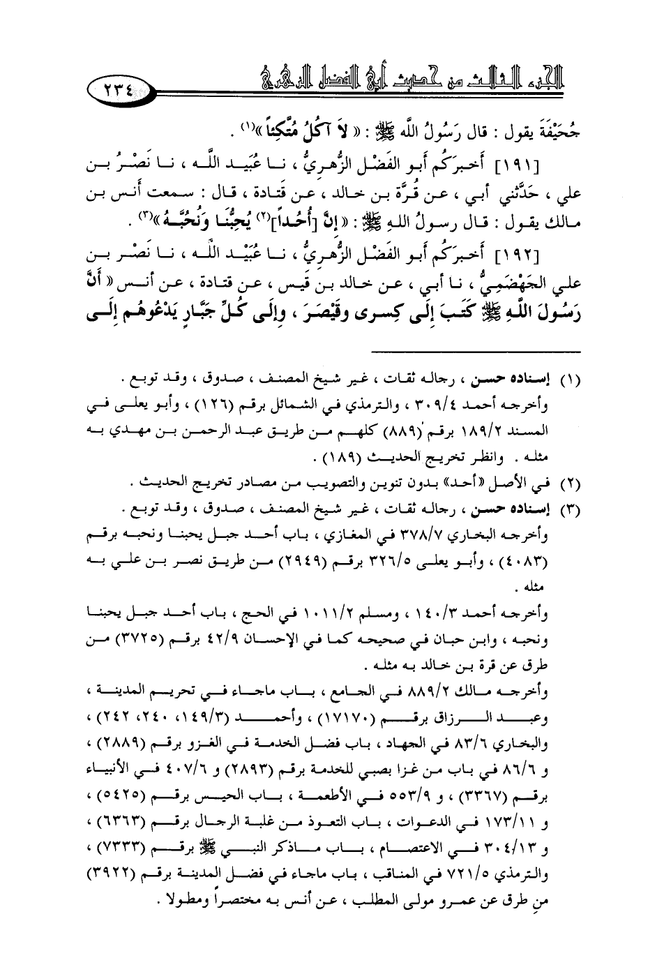 191 - أَخْبَرَكُمْ أَبُو الْفَضْلِ الزُّهْرِيُّ، نا عُبَيْدُ اللَّهِ، نا نَصْرُ بْنُ عَلِيٍّ، حَدَّثَنِي أَبِي، عَنْ قُرَّةَ بْنِ خَالِدٍ، عَنْ قَتَادَةَ، قَالَ: سَمِعْتُ أَنَسَ بْنَ مَالِكٍ، يَقُولُ: قَالَ رَسُولُ اللَّهِ صَلَّى اللَّهُ عَلَيْهِ وَسَلَّمَ: «إِنَّ أُحُدًا يُحِبُّنَا وَنُحِبُّهُ»