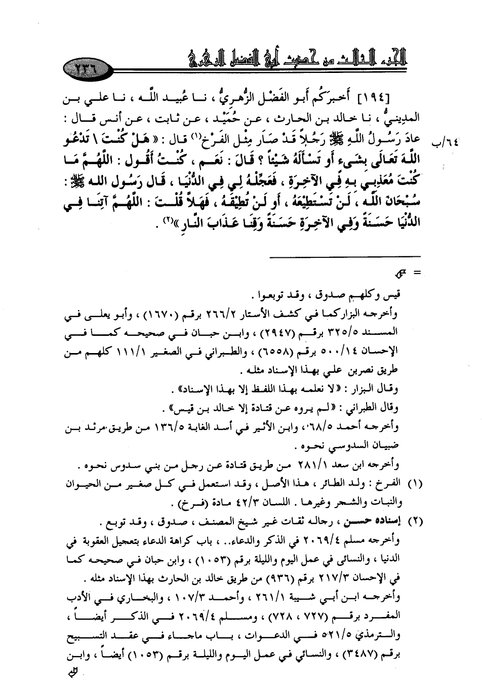 194 - أَخْبَرَكُمْ أَبُو الْفَضْلِ الزُّهْرِيُّ، نا عُبَيْدُ اللَّهِ، نا عَلِيُّ بْنُ الْمَدِينِيِّ، نا خَالِدُ بْنُ الْحَارِثِ، عَنْ حُمَيْدٍ، عَنْ ثَابِتٍ، عَنْ أَنَسِ، قَالَ: عَادَ رَسُولُ اللَّهِ صَلَّى اللَّهُ عَلَيْهِ وَسَلَّمَ رَجُلًا قَدْ صَارَ مِثْلَ الْفَرْخِ. قَالَ: «هَلْ كُنْتَ تَدْعُو اللَّهَ تَعَالَى بِشَيْءٍ أَوْ تَسْأَلُهُ شَيْئًا؟» قَالَ: نَعَمْ، كُنْتُ أَقُولُ: اللَّهُمَّ مَا كُنْتَ مُعَذِّبِي بِهِ فِي الْآخِرَةِ، فَعَجِّلْهُ لِي فِي الدُّنْيَا، قَالَ رَسُولُ اللَّهِ صَلَّى اللَّهُ عَلَيْهِ وَسَلَّمَ: " سُبْحَانَ اللَّهِ، لَنْ تَسْتَطِيعَهُ - أَوْ لَنْ تُطِيقَهُ - فَهَلَّا قُلْتَ: اللَّهُمَّ , آتِنَا فِي الدُّنْيَا حَسَنَةً , وَفِي الْآخِرَةِ حَسَنَةً وَقِنَا عَذَابَ النَّارِ "