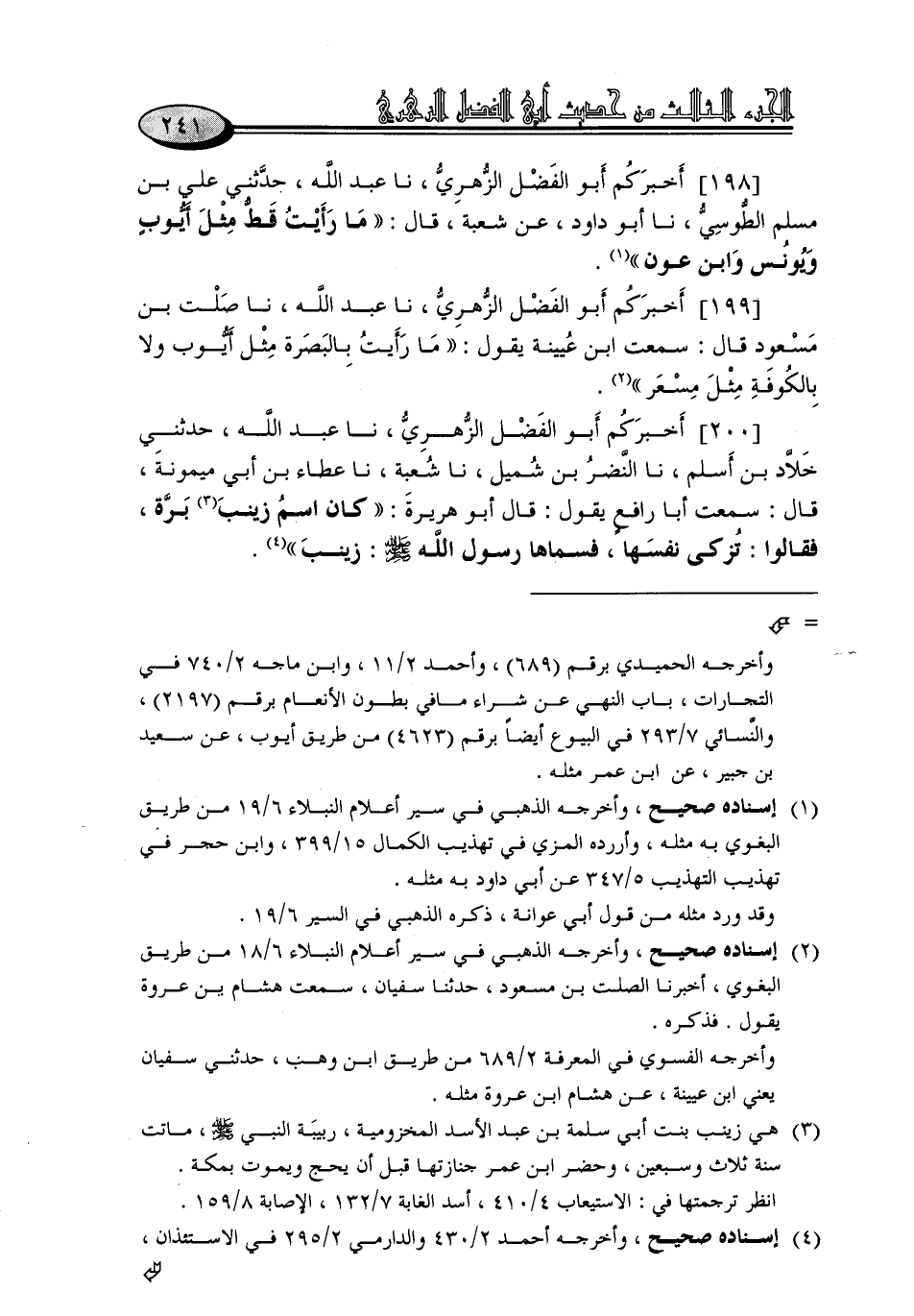 200 - أَخْبَرَكُمْ أَبُو الْفَضْلِ الزُّهْرِيُّ، نا عَبْدُ اللَّهِ، حَدَّثَنِي خَلَّادُ بْنُ أَسْلَمَ، نا النَّضْرُ بْنُ شُمَيْلٍ، نا شُعْبَةُ، نا عَطَاءُ بْنُ أَبِي مَيْمُونَةَ، قَالَ: سَمِعْتُ أَبَا رَافِعٍ، يَقُولُ: قَالَ أَبُو هُرَيْرَةَ: " كَانَ اسْمُ زَيْنَبَ بَرَّةَ، فَقَالُوا: تُزَكِّي نَفْسَهَا، فَسَمَّاهَا رَسُولُ اللَّهِ صَلَّى اللَّهُ عَلَيْهِ وَسَلَّمَ: زَيْنَبَ "