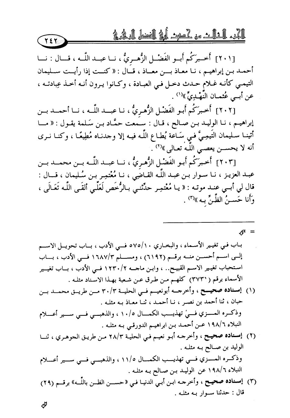 201 - أَخْبَرَكُمْ أَبُو الْفَضْلِ الزُّهْرِيُّ، نا عَبْدُ اللَّهِ، قَالَ: نا أَحْمَدُ بْنُ إِبْرَاهِيمَ، نا مُعَاذُ بْنُ مُعَاذٍ، قَالَ: «كُنْتُ إِذَا رَأَيْتُ سُلَيْمَانَ التَّيْمِيَّ كَأَنَّهُ غُلَامٌ حَدَثُ دَخَلَ فِي الْعِبَادَةِ، وَكَانُوا يَرَوْنَ أَنَّهُ أَخَذَ عِبَادَتِهِ، عَنْ أَبِي عُثْمَانَ النَّهْدِيِّ»