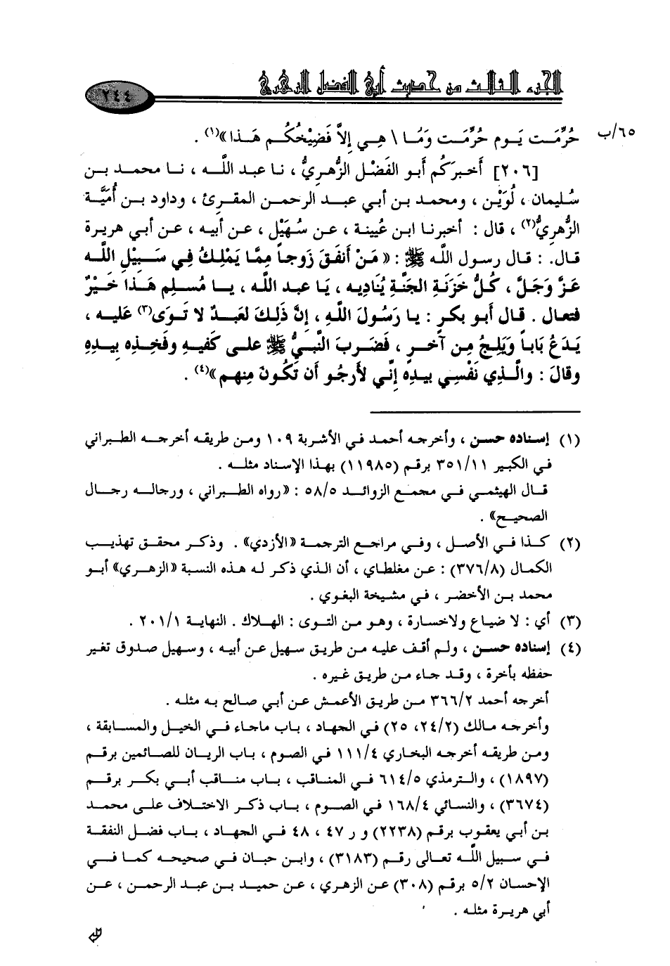 206 - أَخْبَرَكُمْ أَبُو الْفَضْلِ الزُّهْرِيُّ، نا عَبْدُ اللَّهِ، نا مُحَمَّدُ بْنُ سُلَيْمَانَ لُوَيْنٌ، وَمُحَمَّدُ بْنُ أَبِي عَبْدِ الرَّحْمَنِ الْمُقْرِئُ، وَدَاوُدُ بْنُ أُمَيَّةَ الزُّهْرِيُّ، قَالَ: أَخْبَرَنَا ابْنُ عُيَيْنَةَ، عَنْ سُهَيْلٍ، عَنْ أَبِيهِ، عَنْ أَبِي هُرَيْرَةَ، قَالَ: قَالَ رَسُولُ اللَّهِ صَلَّى اللَّهُ عَلَيْهِ وَسَلَّمَ: «مَنْ أَنْفَقَ زَوْجًا مِمَّا يَمْلِكُ فِي سَبِيلِ اللَّهِ عَزَّ وَجَلَّ، كُلُّ خَزَنَةِ الْجَنَّةِ يُنَادِيهِ، يَا عَبْدَ اللَّهِ، يَا مُسْلِمُ هَذَا خَيْرٌ , فَتَعَالَ». قَالَ أَبُو بَكْرٍ: يَا رَسُولَ اللَّهِ، إِنَّ ذَلِكَ لِعَبْدٌ لَا تَوَى عَلَيْهِ، يَدَعُ بَابًا , وَيَلِجُ مِنْ آخَرٍ، فَضَرَبَ النَّبِيُّ صَلَّى اللَّهُ عَلَيْهِ وَسَلَّمَ عَلَى كَفَّيْهِ وَفَخِذِهِ بِيَدِهِ , وَقَالَ: «وَالَّذِي نَفْسِي بِيَدِهِ إِنِّي لَأَرْجُوا أَنْ تَكُونَ مِنْهُمْ»