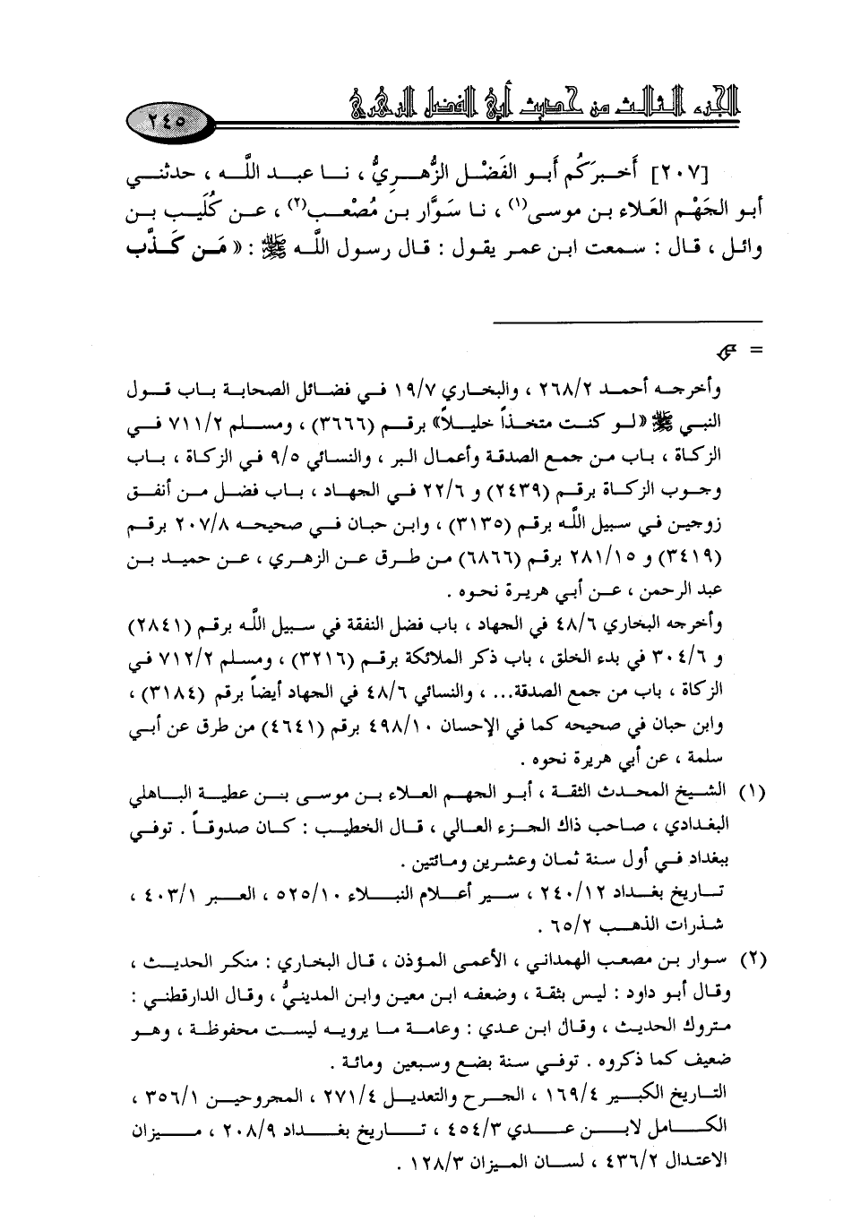 207 - أَخْبَرَكُمْ أَبُو الْفَضْلِ الزُّهْرِيُّ، نا عَبْدُ اللَّهِ، حَدَّثَنِي أَبُو الْجَهْمِ الْعَلَاءُ بْنُ مُوسَى، نا سِوَارُ بْنُ مُصْعَبٍ، عَنْ كُلَيْبِ بْنِ وَائِلٍ، قَالَ: سَمِعْتُ ابْنَ عُمَرَ، يَقُولُ: قَالَ رَسُولُ اللَّهِ صَلَّى اللَّهُ عَلَيْهِ وَسَلَّمَ: «مَنْ كَذَّبَ -[246]- بِالْقَدَرِ أَوْ خَاصَمَهُمْ فَقَدْ كَفَرَ بِمَا جِئْتُ بِهِ»