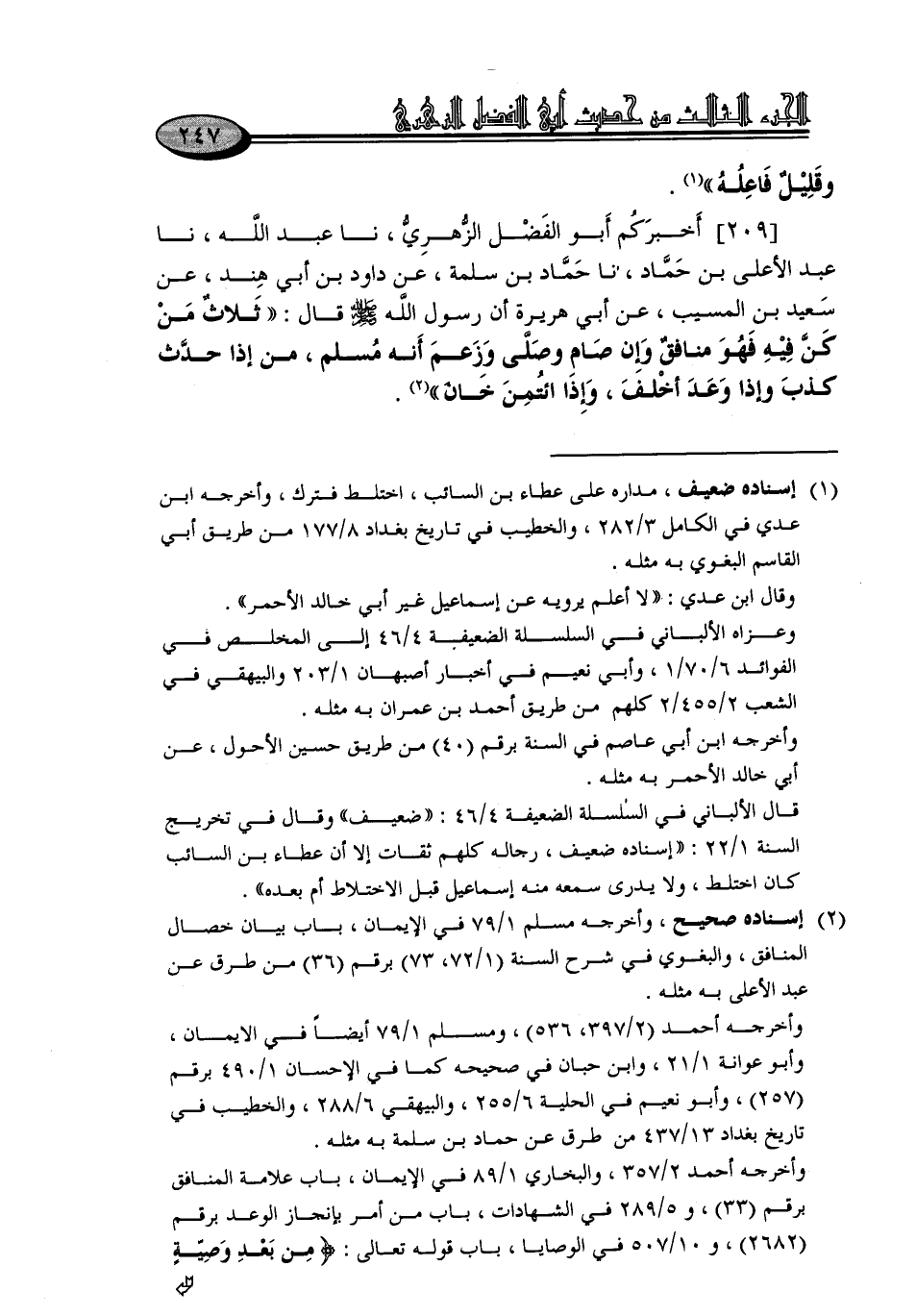 209 - أَخْبَرَكُمْ أَبُو الْفَضْلِ الزُّهْرِيُّ، نا عَبْدُ اللَّهِ، نا عَبْدُ الْأَعْلَى بْنُ حَمَّادٍ، نا حَمَّادُ بْنُ سَلَمَةَ، عَنْ دَاوُدَ بْنِ أَبِي هِنْدَ، عَنْ سَعِيدِ بْنِ الْمُسَيِّبِ، عَنْ أَبِي هُرَيْرَةَ، أَنَّ رَسُولَ اللَّهِ صَلَّى اللَّهُ عَلَيْهِ وَسَلَّمَ قَالَ: «ثَلَاثٌ مَنْ كُنَّ فِيهِ فَهُوَ مُنَافِقٌ , وَإِنْ صَامَ وَصَلَّى وَزَعَمَ أَنَّهُ مُسْلِمٌ، مَنْ إِذَا حَدَّثَ كَذَبَ , وَإِذَا وَعَدَ أَخْلَفَ، وَإِذَا ائْتُمِنَ خَانَ»