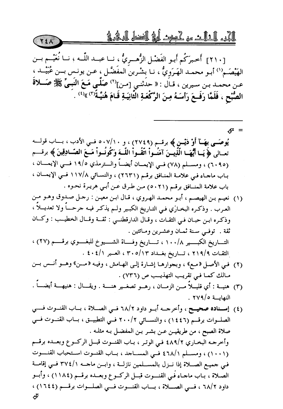 210 - أَخْبَرَكُمْ أَبُو الْفَضْلِ الزُّهْرِيُّ، نا عَبْدُ اللَّهِ، نا نُعَيْمُ بْنُ الْهَيْصَمِ أَبُو مُحَمَّدٍ الْهَرَوِيُّ، نا بِشْرُ بْنُ الْمُفَضَّلِ، عَنْ يُونُسَ بْنِ عُبَيْدٍ، عَنْ مُحَمَّدِ بْنِ سِيرِينَ، قَالَ: «حَدَّثَنِي مَنْ، صَلَّى مَعَ النَّبِيِّ صَلَّى اللَّهُ عَلَيْهِ وَسَلَّمَ صَلَاةَ الصُّبْحِ، فَلَمَّا رَفَعَ رَأْسَهُ مِنَ الرَّكْعَةِ الثَّانِيَةِ قَامَ هُنَيَّةً»