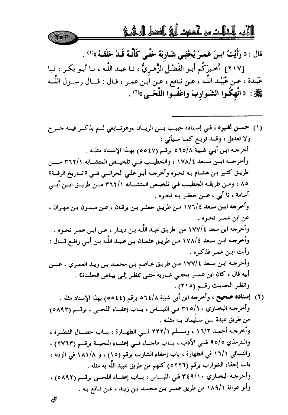 217 - أَخْبَرَكُمْ أَبُو الْفَضْلِ الزُّهْرِيُّ، نا عَبْدُ اللَّهِ، نا أَبُو بَكْرٍ، نا عَبْدَةُ، عَنْ عُبَيْدِ اللَّهِ، عَنْ نَافِعٍ، عَنِ ابْنِ عُمَرَ، قَالَ: قَالَ رَسُولُ اللَّهِ صَلَّى اللَّهُ عَلَيْهِ وَسَلَّمَ: «انْهَكُوا الشَّوَارِبَ , وَاعْفُوا اللِّحَى»