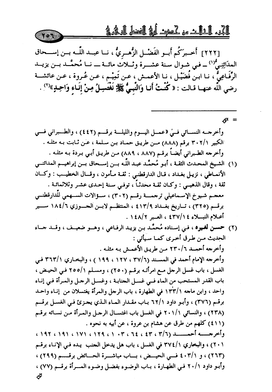 222 - أَخْبَرَكُمْ أَبُو الْفَضْلِ الزُّهْرِيُّ، نا عَبْدُ اللَّهِ بْنُ إِسْحَاقَ الْمَدَائِنِيُّ، - فِي شَوَّالٍ سَنَةَ عَشْرَةٍ وَثَلَاثِ مِائَةٍ - نا مُحَمَّدُ بْنُ يَزِيدَ الرِّفَاعِيُّ، نا ابْنُ فُضَيْلٍ، نا الْأَعْمَشُ، عَنْ تَمِيمٍ، عَنْ عُرْوَةَ، عَنْ عَائِشَةَ رَضِيَ اللَّهُ عَنْهَا قَالَتْ: كُنْتُ أَنَا وَالنَّبِيُّ صَلَّى اللَّهُ عَلَيْهِ وَسَلَّمَ نَغْتَسِلُ مِنْ إِنَاءٍ وَاحِدٍ