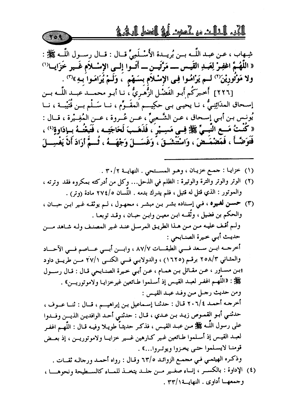 226 - أَخْبَرَكُمْ أَبُو الْفَضْلِ الزُّهْرِيُّ، نا أَبُو مُحَمَّدٍ عَبْدُ اللَّهِ بْنُ إِسْحَاقَ الْمَدَائِنِيُّ، نا يَحْيَى بْنُ حَكِيمٍ الْمُقَوِّمُ، نا سَلْمُ بْنُ قُتَيْبَةَ، نا يُونُسُ بْنُ أَبِي إِسْحَاقَ، عَنِ الشَّعْبِيِّ، عَنْ عُرْوَةَ، عَنِ الْمُغِيرَةِ، قَالَ: كُنْتُ مَعَ النَّبِيِّ صَلَّى اللَّهُ عَلَيْهِ وَسَلَّمَ فِي مَسِيرٍ، فَذَهَبَ لِحَاجَتِهِ، فَتَبِعْتُهُ بِإِدَاوَةٍ، فَتَوَضَّأَ، فَمَضْمَضَ، وَاسْتَنْشَقَ، وَغَسَلَ وَجْهَهُ، ثُمَّ أَرَادَ أَنْ يَغْسِلَ -[260]- ذِرَاعَيْهِ فَلَمْ يُخْرِجْ ذِرَاعَيْهِ مِنْ ضِيقَةِ الْكُمِّ، فَأَخْرَجَهَا مِنْ تَحْتِ الْجُبَّةِ، فَغَسَلَ ذِرَاعَيْهِ وَمَسَحَ بِرَأْسِهِ، ثُمَّ أَهْوَيْتُ إِلَى خُفَّيْهِ لِأَخْلَعَهُمَا , فَقَالَ: «يَا مُغِيرَةُ، أَقَرَّ الْخُفَّيْنِ قَرَارَهُمَا، إِنِّي أَدْخَلْتُ الْخُفَّيْنِ , وَهُمَا طَاهِرَتَانِ» , فَتَوَضَّأَ رَسُولُ اللَّهِ صَلَّى اللَّهُ عَلَيْهِ وَسَلَّمَ , وَمَسَحَ عَلَى خُفَّيْهِ، فَشَهِدَ الْمُغِيرَةُ عَلَى رَسُولِ اللَّهِ صَلَّى اللَّهُ عَلَيْهِ وَسَلَّمَ بِذَلِكَ، وَشَهِدَ عُرْوَةُ عَلَى الْمُغِيرَةِ بِذَلِكَ، وَشَهِدَ الشَّعْبِيُّ عَلَى عُرْوَةَ بِذَلِكَ، وَشَهِدَ يُونُسُ عَلَى الشَّعْبِيِّ بِذَلِكَ، وَشَهِدَ سَلْمٌ عَلَى يُونُسَ بِذَلِكَ، وَقَالَ لَنَا سَلْمٌ: اشْهَدُوا عَلَيَّ بِذَلِكَ، وَشَهِدَ يَحْيَى عَلَى سَلْمِ بِذَلِكَ قَالَ أَبُو مُحَمَّدٍ: وَاشْهَدُوا عَلَيَّ بِذَلِكَ. قَالَ أَبُو الْفَضْلِ الزُّهْرِيُّ: وَأَنَا أَشْهَدُ عَلَى عَبْدِ اللَّهِ بِذَلِكَ، وَاشْهَدُوا عَلَيَّ بِذَلِكَ. قَالَ الشَّيْخُ أَبُو مُحَمَّدٍ الْجَوْهَرِيُّ: وَأَنَا أَشْهَدُ عَلَى أَبِي الْفَضْلِ الزُّهْرِيِّ بِذَلِكَ، وَاشْهَدُوا عَلَيَّ بِذَلِكَ.