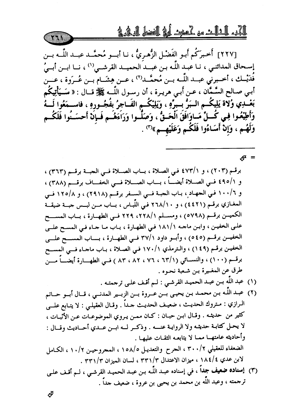 227 - أَخْبَرَكُمْ أَبُو الْفَضْلِ الزُّهْرِيُّ، نا أَبُو مُحَمَّدٍ عَبْدُ اللَّهِ بْنُ إِسْحَاقَ الْمَدَائِنِيُّ، نا عَبْدُ اللَّهِ بْنُ عَبْدِ الْحَمِيدِ الْقُرَشِيُّ، نا ابْنُ أَبِي فُدَيْكٍ، أَخْبَرَنِي عَبْدُ اللَّهِ بْنُ مُحَمَّدٍ، عَنْ هِشَامِ بْنِ عُرْوَةَ، عَنْ أَبِي صَالِحٍ السَّمَّانِ، عَنْ أَبِي هُرَيْرَةَ، أَنَّ رَسُولَ اللَّهِ صَلَّى اللَّهُ عَلَيْهِ وَسَلَّمَ قَالَ: «سَيَأْتِيكُمْ بَعْدِي وُلَاةٌ يَلِيكُمُ الْبَرُّ بِبِرِّهِ، وَيَلِيكُمُ الْفَاجِرُ بِفُجُورِهِ، فَاسْمَعُوا لَهُ وَأَطِيعُوا فِي كُلِّ مَا وَافَقَ الْحَقَّ، وَصَلُّوا وَرَاءَهُمْ , فَإِنْ أَحْسَنُوا فَلَكُمْ وَلَهُمْ، وَإِنْ أَسَاءُوا فَلَكُمْ وَعَلَيْهِمْ»