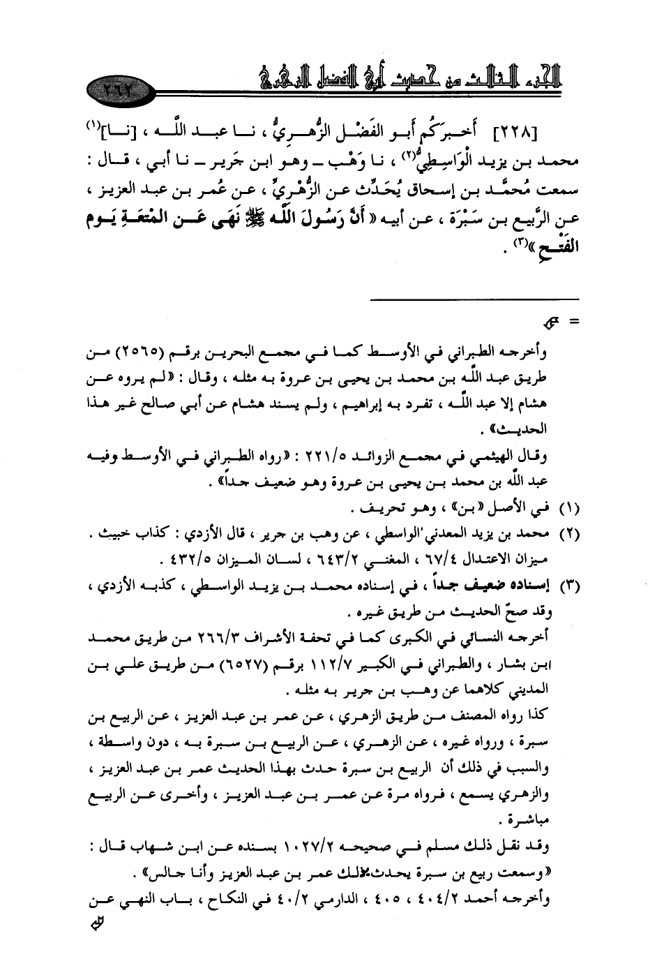 228 - أَخْبَرَكُمْ أَبُو الْفَضْلِ الزُّهْرِيُّ، نا عَبْدُ اللَّهِ، نا مُحَمَّدُ بْنُ يَزِيدَ الْوَاسِطِيُّ، نا وَهْبٌ وَهُوَ ابْنُ جَرِيرٍ، نا أَبِي قَالَ: سَمِعْتُ مُحَمَّدَ بْنَ إِسْحَاقَ، يُحَدِّثُ عَنِ الزُّهْرِيِّ، عَنْ عُمَرَ بْنِ عَبْدِ الْعَزِيزِ، عَنِ الرَّبِيعِ بْنِ سَبْرَةَ، عَنْ أَبِيهِ: «أَنَّ رَسُولَ اللَّهِ صَلَّى اللَّهُ عَلَيْهِ وَسَلَّمَ نَهَى عَنِ الْمُتْعَةِ يَوْمَ الْفَتْحِ»