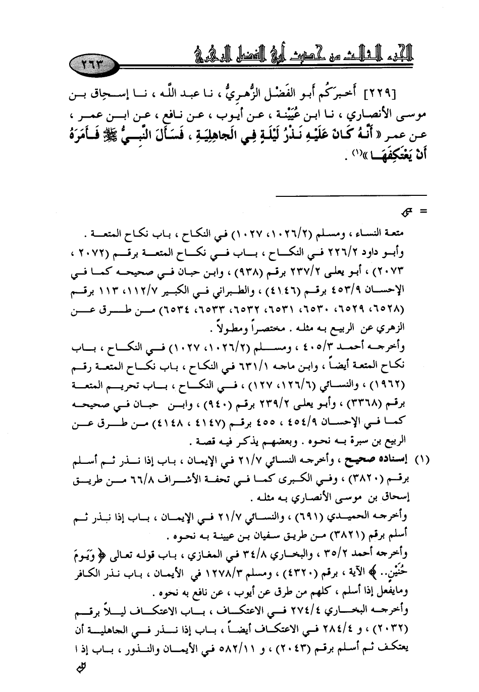 229 - أَخْبَرَكُمْ أَبُو الْفَضْلِ الزُّهْرِيُّ، نا عَبْدُ اللَّهِ، نا إِسْحَاقُ بْنُ مُوسَى الْأَنْصَارِيُّ، نا ابْنُ عُيَيْنَةَ، عَنْ أَيُّوبَ، عَنْ نَافِعٍ، عَنِ ابْنِ عُمَرَ، عَنْ عُمَرَ: «أَنَّهُ كَانَ عَلَيْهِ نَذَرُ لَيْلَةٍ فِي الْجَاهِلِيَّةِ، فَسَأَلَ النَّبِيُّ صَلَّى اللَّهُ عَلَيْهِ وَسَلَّمَ , فَأَمَرَهُ أَنْ يَعْتَكِفَهَا»