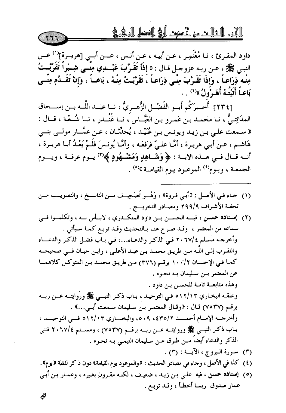 234 - أَخْبَرَكُمْ أَبُو الْفَضْلِ الزُّهْرِيُّ، نا عَبْدُ اللَّهِ بْنُ إِسْحَاقَ الْمَدَائِنِيُّ، نا مُحَمَّدُ بْنُ عَمْرِو بْنِ الْعَبَّاسِ، نا غُنْدَرٌ، نا شُعْبَةُ، قَالَ: سَمِعْتُ عَلِيَّ بْنَ زَيْدٍ، وَيُونُسَ بْنَ عُبَيْدٍ يُحَدِّثَانِ، عَنْ عَمَّارٍ مَوْلَى بَنِي هَاشِمٍ، عَنْ أَبِي هُرَيْرَةَ، أَمَّا عَلِيٌّ فَرَفَعَهُ، وَأَمَّا يُونُسُ , فَلَمْ يَعْدُ أَبَا هُرَيْرَةَ أَنَّهُ قَالَ فِي هَذِهِ الْآيَةِ {وَشَاهِدٍ وَمَشْهُودٍ} [البروج: 3]: يَوْمُ عَرَفَةَ، وَيَوْمُ الْجُمُعَةِ، وَيَوْمُ الْمَوْعُودِ يَوْمُ الْقِيَامَةِ