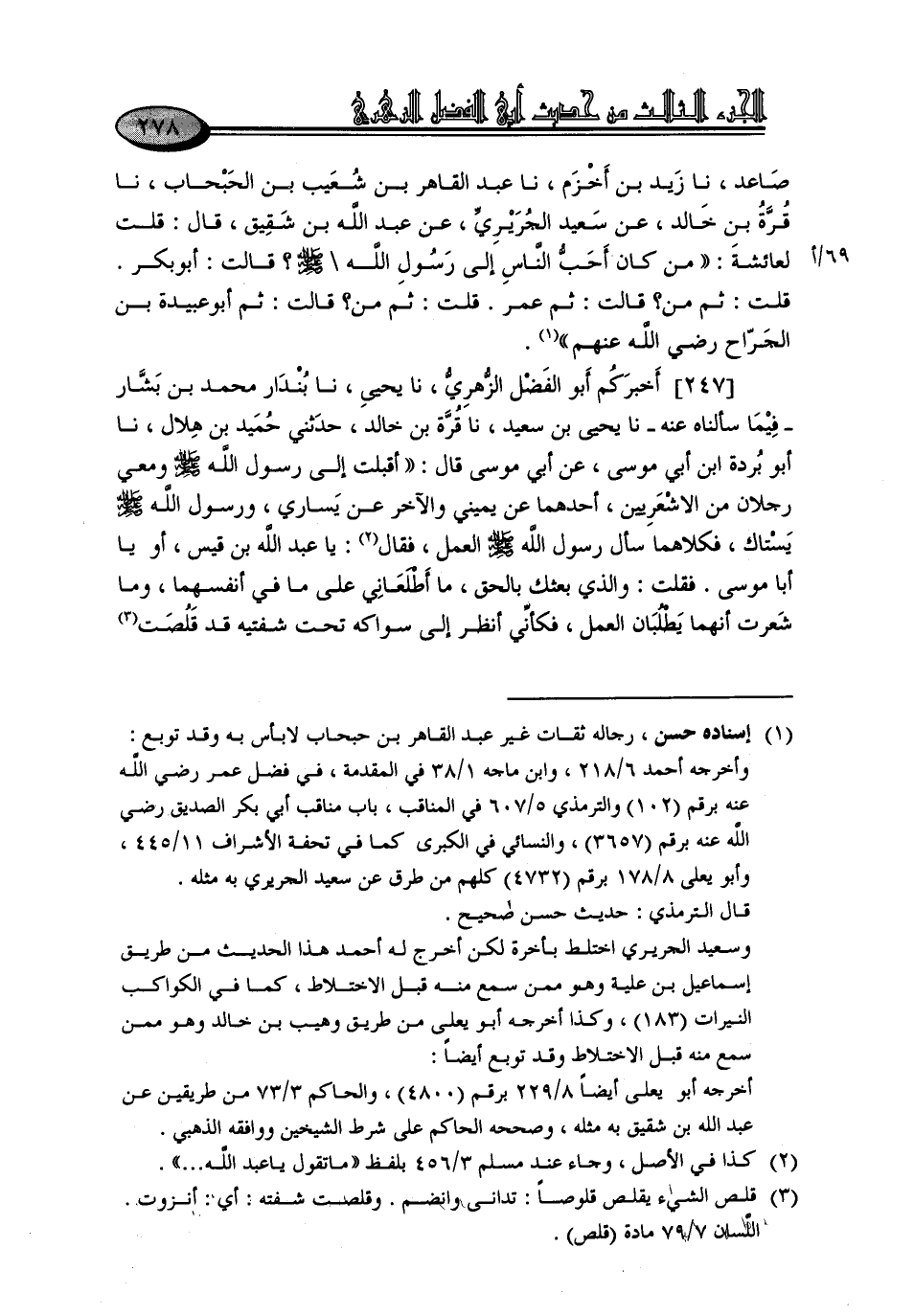 247 - أَخْبَرَكُمْ أَبُو الْفَضْلِ الزُّهْرِيُّ، نا يَحْيَى، نا بُنْدَارٌ مُحَمَّدُ بْنُ بَشَّارٍ - فِيمَا سَأَلْنَاهُ عَنْهُ - نا يَحْيَى بْنُ سَعِيدٍ، نا قُرَّةُ بْنُ خَالِدٍ، حَدَّثَنِي حُمَيْدُ بْنُ هِلَالٍ، نا أَبُو بُرْدَةَ بْنُ أَبِي مُوسَى، عَنْ أَبِي مُوسَى، قَالَ: أَقْبَلْتُ إِلَى رَسُولِ اللَّهِ صَلَّى اللَّهُ عَلَيْهِ وَسَلَّمَ وَمَعِي رَجُلَانِ مِنَ الْأَشْعَرِيِّينَ، أَحَدُهُمَا عَنْ يَمِينِي وَالْآخَرُ عَنْ يَسَارِي، وَرَسُولُ اللَّهِ صَلَّى اللَّهُ عَلَيْهِ وَسَلَّمَ يَسْتَاكُ، فَكِلَاهُمَا سَأَلَ رَسُولَ اللَّهِ صَلَّى اللَّهُ عَلَيْهِ وَسَلَّمَ الْعَمَلَ، فَقَالَ: «يَا عَبْدَ اللَّهِ بْنَ قَيْسٍ - أَوْ يَا أَبَا مُوسَى -». فَقُلْتُ: وَالَّذِي بَعَثَكَ بِالْحَقِّ، مَا أَطْلَعَانِي عَلَى مَا فِي أَنْفُسِهِمَا، وَمَا شَعَرْتُ أَنَّهُمَا يَطْلُبَانِ الْعَمَلَ، فَكَأَنِّي أَنْظُرُ إِلَى سِوَاكِهِ تَحْتَ شَفَتَيْهِ قَدْ قَلَصَتْ , -[279]- فَقَالَ: «إِنَّا لَا نَسْتَعْمِلُ عَلَى عَمِلْنَا مَنْ أَرَادَهُ» وَلَكِنِ اذْهَبْ أَنْتَ يَا أَبَا مُوسَى - أَوْ يَا عَبْدَ اللَّهِ بْنَ قَيْسٍ - " فَبَعَثَهُ عَلَى الْيَمَنِ، ثُمَّ أَتْبَعَهُ مُعَاذَ بْنَ جَبَلٍ، فَلَمَّا قَدِمَ أَلْقَى لَهُ وِسَادَةً، فَقَالَ: انْزِلْ، فَإِذَا رَجُلٌ عِنْدَهُ مُوثَقٌ , فَقَالَ: مَا هَذَا؟ قَالَ: يَهُودِيٌّ قَدْ أَسْلَمَ , ثُمَّ رَاجَعَ دِينَهُ، دِينَ السُّوءِ، فَتَهَوَّدَ، فَقَالَ: لَا أَجْلِسُ حَتَّى يُقْتَلَ قَضَاءُ اللَّهِ وَرَسُولِهِ، فَقَالَ: اجْلِسْ. قَالَ: لَا أَجْلِسُ حَتَّى يُقْتَلَ - ثَلَاثَ مَرَّاتٍ - فَأَمَرَ بِهِ فَقُتِلَ، ثُمَّ تَذَاكَرَا قِيَامَ اللَّيْلِ، فَقَامَ أَحَدُهُمَا - مُعَاذُ بْنُ جَبَلٍ -: أَمَّا أَنَا , فَأَقُومُ وَأَنَامُ، وَأَرْجُو فِي نَوْمَتِي مَا أَرْجُو فِي قَوْمَتِي