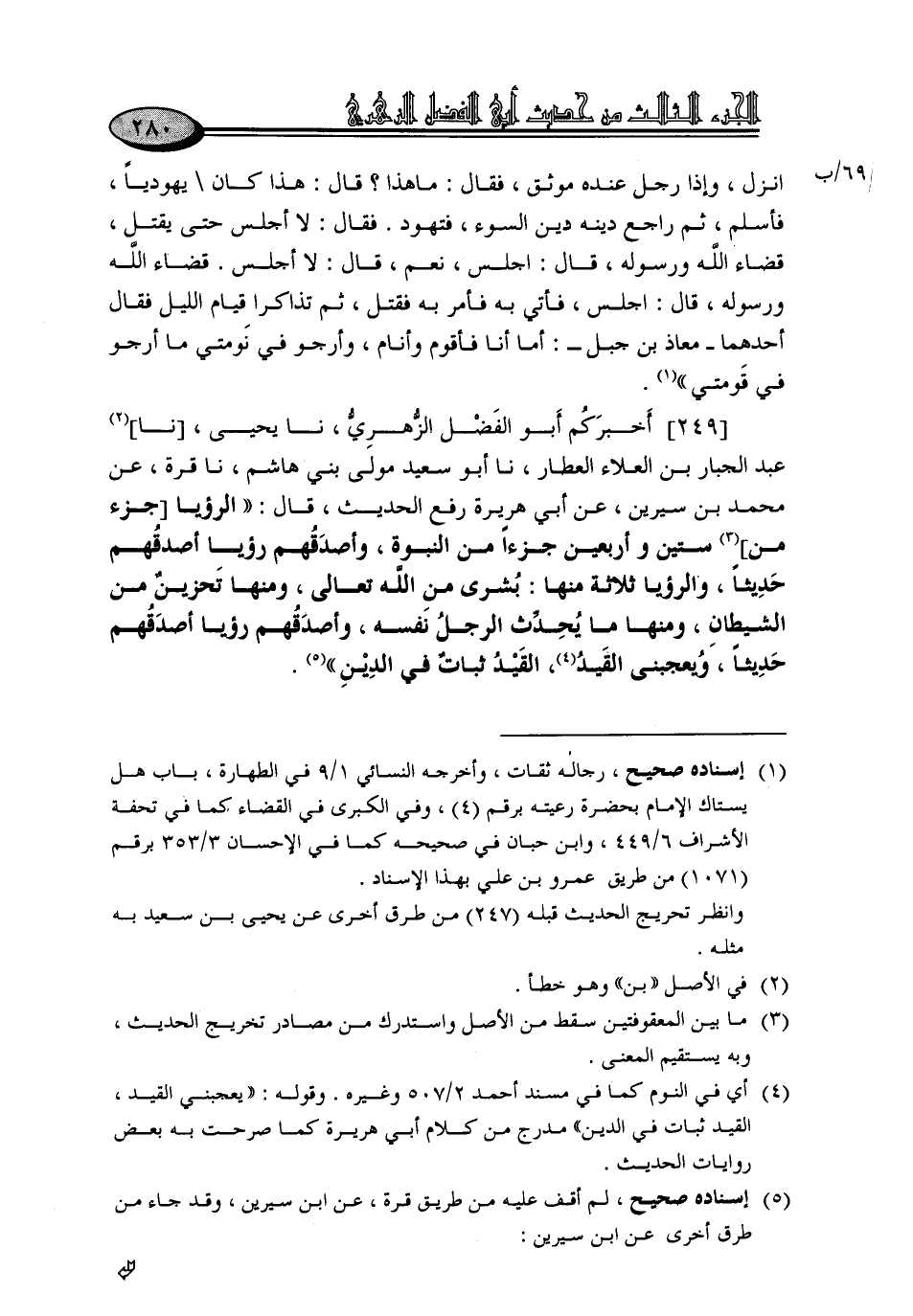 249 - أَخْبَرَكُمْ أَبُو الْفَضْلِ الزُّهْرِيُّ، نا يَحْيَى، نا عَبْدُ الْجَبَّارِ بْنُ الْعَلَاءِ الْعَطَّارُ، نا أَبُو سَعِيدٍ مَوْلَى بَنِي هَاشِمٍ، نا قُرَّةُ، عَنْ مُحَمَّدِ بْنِ سِيرِينَ، عَنْ أَبِي هُرَيْرَةَ، رَفَعَ الْحَدِيثَ قَالَ: " الرُّؤْيَا جُزْءٌ مِنْ سِتَّةٍ وَأَرْبَعِينَ جُزْءًا مِنَ النُّبُوَّةِ، وَأَصْدَقُهُمْ رُؤْيَا أَصْدَقُهُمْ حَدِيثًا، وَالرُّؤْيَا ثَلَاثَةٌ مِنْهَا: بُشْرَى مِنَ اللَّهِ تَعَالَى، وَمِنْهَا تَحْزِينٌ مِنَ الشَّيْطَانِ، وَمِنْهَا مَا يُحَدِّثُ الرَّجُلُ نَفْسَهُ، وَأَصْدَقُهُمْ رُؤْيَا أَصْدَقُهُمْ حَدِيثًا، وَيُعْجِبُنِي الْقَيْدُ، الْقَيْدُ ثَبَاتٌ فِي الدِّينِ "