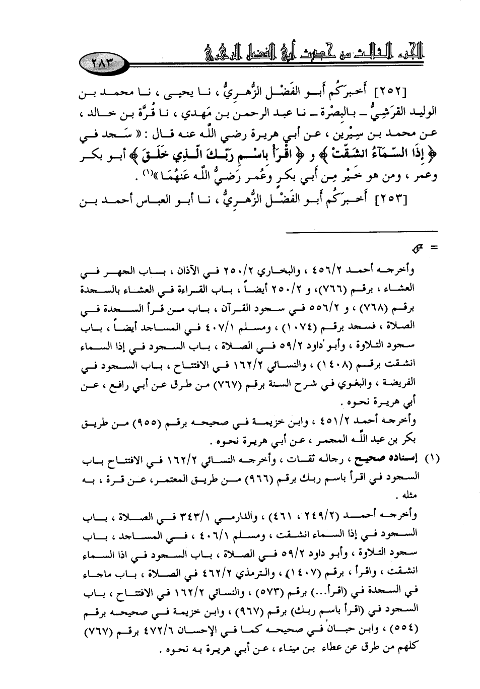 252 - أَخْبَرَكُمْ أَبُو الْفَضْلِ الزُّهْرِيُّ، نا يَحْيَى، نا مُحَمَّدُ بْنُ الْوَلِيدِ الْقُرَشِيُّ، بِالْبَصْرَةَ , نا عَبْدُ الرَّحْمَنِ بْنُ مَهْدِيٍّ، نا قُرَّةُ بْنُ خَالِدٍ، عَنْ مُحَمَّدِ بْنِ سِيرِينَ، عَنْ أَبِي هُرَيْرَةَ، رَضِيَ اللَّهُ عَنْهُ، قَالَ: «سَجَدَ فِي إِذَا السَّمَاءُ انْشَقَّتْ واقْرَأْ بِاسْمِ رَبِّكَ الَّذِي خَلَقَ أَبُو بَكْرٍ وَعُمَرُ، وَمَنْ هُوَ خَيْرٌ مِنْ أَبِي بَكْرٍ وَعُمَرَ رَضِيَ اللَّهُ عَنْهُمَا»
