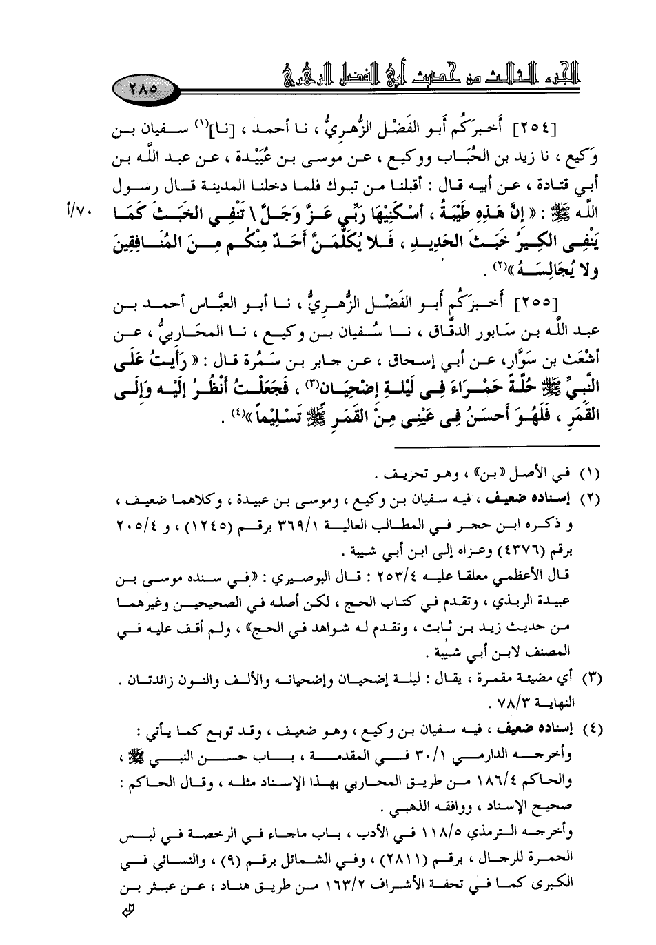 255 - أَخْبَرَكُمْ أَبُو الْفَضْلِ الزُّهْرِيُّ، نا أَبُو الْعَبَّاسِ أَحْمَدُ بْنُ عَبْدِ اللَّهِ بْنِ سَابُورَ الدَّقَّاقُ، نا سُفْيَانُ بْنُ وَكِيعٍ، نا الْمُحَارِبِيُّ، عَنْ أَشْعَثَ بْنِ سِوَارٍ، عَنْ أَبِي إِسْحَاقَ، عَنْ جَابِرِ بْنِ سَمُرَةَ، قَالَ: «رَأَيْتُ عَلَى النَّبِيِّ صَلَّى اللَّهُ عَلَيْهِ وَسَلَّمَ حُلَّةً حَمْرَاءَ فِي لَيْلَةٍ إِضْحِيَانٍ، فَجَعَلْتُ أَنْظُرُ إِلَيْهِ وَإِلَى الْقَمَرِ، فَلَهُوَ أَحْسَنُ فِي عَيْنِي مِنَ الْقَمَرِ صَلَّى اللَّهُ عَلَيْهِ وَسَلَّمَ تَسْلِيمًا»