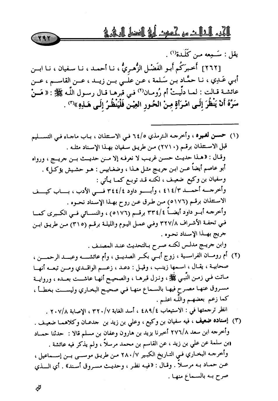 262 - أَخْبَرَكُمْ أَبُو الْفَضْلِ الزُّهْرِيُّ، نا أَحْمَدُ، نا سُفْيَانُ، نا ابْنُ أَبِي عَدِيٍّ، نا حَمَّادُ بْنُ سَلَمَةَ، عَنْ عَلِيِّ بْنِ زَيْدٍ، عَنِ الْقَاسِمِ، عَنْ عَائِشَةَ، قَالَتْ: لَمَّا دُلِّيَتْ أُمُّ رُومَانَ فِي قَبْرِهَا. قَالَ رَسُولُ اللَّهِ صَلَّى اللَّهُ عَلَيْهِ وَسَلَّمَ: «مَنْ سَرَّهُ أَنْ يَنْظُرَ إِلَى امْرَأَةٍ مِنَ الْحُورِ الْعَيْنِ فَلْيَنْظُرْ إِلَى هَذِهِ»