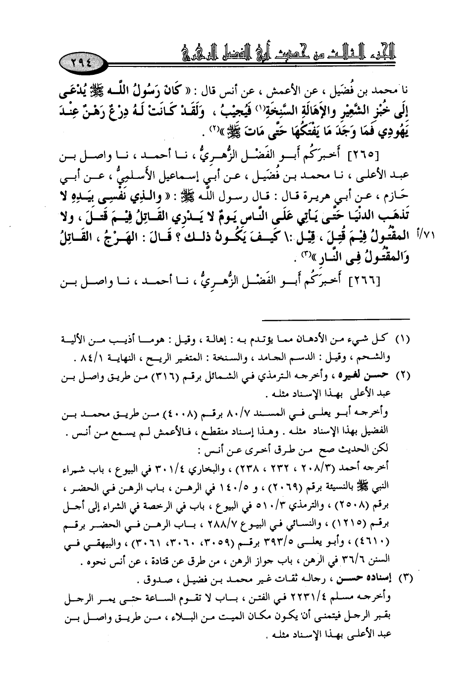 265 - أَخْبَرَكُمْ أَبُو الْفَضْلِ الزُّهْرِيُّ، نا أَحْمَدُ، نا وَاصِلُ بْنُ عَبْدٍ الْأَعْلَى، نا مُحَمَّدُ بْنُ فُضَيْلٍ، عَنْ أَبِي إِسْمَاعِيلَ الْأَسْلَمِيِّ، عَنْ أَبِي حَازِمٍ، عَنْ أَبِي هُرَيْرَةَ، قَالَ: قَالَ رَسُولُ اللَّهِ صَلَّى اللَّهُ عَلَيْهِ وَسَلَّمَ: «وَالَّذِي نَفْسِي بِيَدِهِ , لَا تَذْهَبُ الدُّنْيَا حَتَّى يَأْتِيَ عَلَى النَّاسِ يَوْمٌ لَا يَدْرِي الْقَاتِلُ فِيمَ قَتَلَ، وَلَا الْمَقْتُولُ فِيمَ قُتِلَ»، قِيلَ: كَيْفَ يَكُونُ ذَلِكَ؟ قَالَ: «الْهَرْجُ، الْقَاتِلُ وَالْمَقْتُولُ فِي النَّارِ»