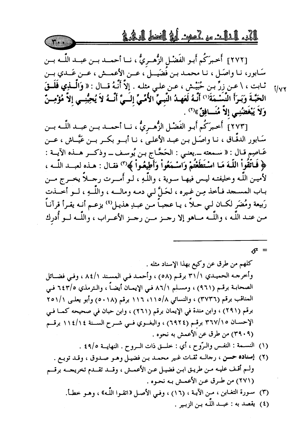 273 - أَخْبَرَكُمْ أَبُو الْفَضْلِ الزُّهْرِيُّ، نا أَحْمَدُ بْنُ عَبْدِ اللَّهِ بْنِ سَابُورَ الدَّقَّاقُ، نا وَاصِلُ بْنُ عَبْدِ الْأَعْلَى، نا أَبُو بَكْرِ بْنُ عَيَّاشٍ، عَنْ عَاصِمٍ، قَالَ: سَمِعْتُهُ - يَعْنِي الْحَجَّاجَ بْنَ يُوسُفَ - وَذَكَرَ هَذِهِ الْآيَةَ: {فَاتَّقُوا اللَّهَ مَا اسْتَطَعْتُمْ وَاسْمَعُوا وَأَطِيعُوا} [التغابن: 16] , فَقَالَ: " هَذِهِ لِعَبْدِ اللَّهِ، لِأَمِينِ اللَّهِ , وَخَلِيفَتِهِ لَيْسَ فِيهَا سَوِيَّةٌ، وَاللَّهِ، لَوْ أَمَرْتُ رَجُلًا يَخْرُجُ مِنْ بَابِ الْمَسْجِدِ , فَأَخَذَ مِنْ غَيْرِهِ، لَحَلَّ لِي دَمُهُ وَمَالُهُ، وَاللَّهِ، لَوْ أَخَذْتُ رَبِيعَةَ وَمُضَرَ لَكَانَ لِي حِلًّا، يَا عَجَبًا مِنْ عَبْدِ هُذَيْلٍ يَزْعُمُ أَنَّهُ يَقْرَأُ قُرْآنًا مِنْ عِنْدِ اللَّهِ، وَاللَّهِ , مَا هُوَ إِلَّا رَجَزًا مِنْ رَجَزِ الْأَعْرَابِ، وَاللَّهِ , لَوْ أُدْرِكَ -[301]- عَبْدُ هُذَيْلٍ لَضَرَبْتُ عُنُقَهُ، وَيَا عَجَبًا مِنْ هَذِهِ الْحَمْرَاءِ - يَعْنِي: الْمَوَالِيَ - إِنَّ أَحَدَهُمْ لِيَأْخُذُ الْحَجَرَ , فَيَرْمِي بِهِ، وَيَقُولُ: لَا يَقَعُ هَذَا حَتَّى يَكُونَ خَيْرٌ " قَالَ أَبُو بَكْرٍ: فَذَكَرْتُ هَذَا الْحَدِيثَ لِلْأَعْمَشِ , فَقَالَ: قَدْ سَمِعْتُهُ مِنْهُ