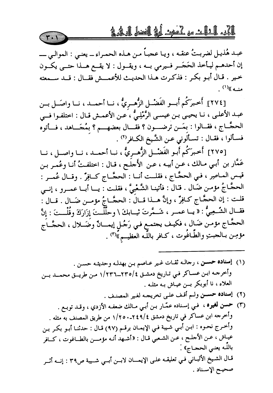 275 - أَخْبَرَكُمْ أَبُو الْفَضْلِ الزُّهْرِيُّ، نا أَحْمَدُ، نا وَاصِلٌ، نا عَمَّارُ بْنُ أَبِي مَالِكٍ، عَنْ أَبِيهِ، عَنِ الْأَجْلَحَ، قَالَ: اخْتَلَفْتُ أَنَا وَعُمَرُ بْنُ قَيْسٍ الْمَاصِرُ، فِي الْحَجَّاجِ، فَقُلْتُ أَنَا: الْحَجَّاجُ، كَافِرٌ - وَقَالَ عُمَرُ: الْحَجَّاجُ الْمُؤْمِنُ ضَالٌّ - قَالَ: فَأَتَيْنَا الشَّعْبِيَّ، فَقُلْتُ: يَا أَبَا عَمْرٍو، إِنِّي قُلْتُ: إِنَّ الْحَجَّاجَ كَافِرٌ، وَإِنَّ هَذَا قَالَ: الْحَجَّاجُ مُؤْمِنٌ ضَالٌّ قَالَ: فَقَالَ الشَّعْبِيُّ: " يَا عُمَرُ، شَمَّرْتَ ثِيَابَكَ , وَحَلَلْتَ إِزَارَكَ , وَقُلْتَ: إِنَّ الْحَجَّاجَ مُؤْمِنٌ ضَالٌّ، وَكَيْفَ يَجْتَمِعُ فِي رَجُلٍ إِيمَانٌ وَضَلَالٌ، الْحَجَّاجُ مُؤْمِنٌ بِالْجِبْتِ وَالطَّاغُوتِ، كَافِرٌ بِاللَّهِ الْعَظِيمِ