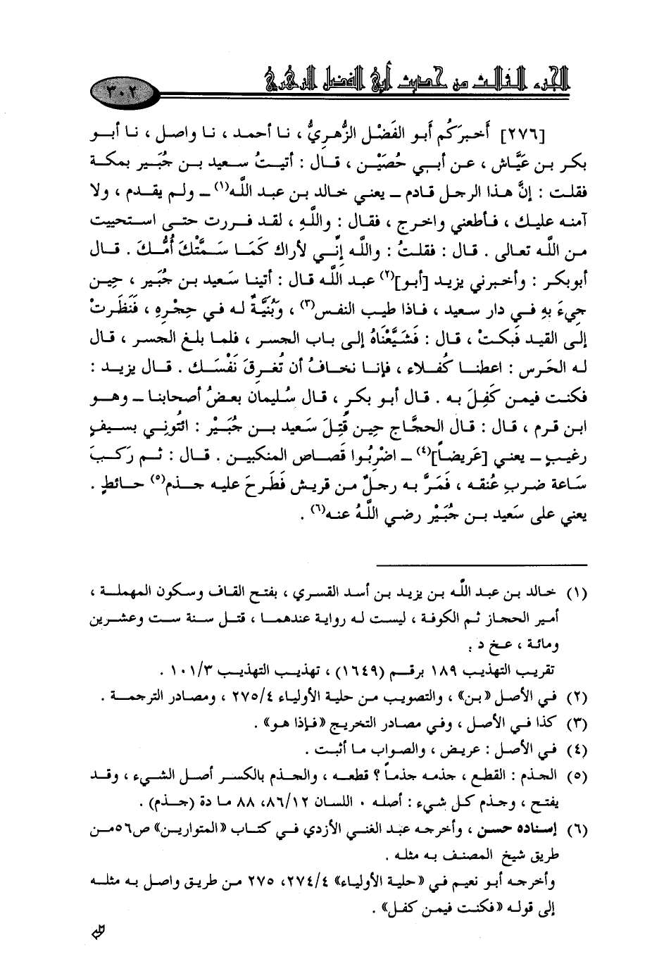 276 - أَخْبَرَكُمْ أَبُو الْفَضْلِ الزُّهْرِيُّ، نا أَحْمَدُ، نا وَاصِلٌ، نا أَبُو بَكْرِ بْنُ عَيَّاشٍ، عَنْ أَبِي حُصَيْنٍ، قَالَ: " أَتَيْتُ سَعِيدَ بْنَ جُبَيْرٍ بِمَكَّةَ , فَقُلْتُ: إِنَّ هَذَا الرَّجُلَ قَادِمٌ - يَعْنِي خَالِدَ بْنَ عَبْدِ اللَّهِ - وَلَمْ يَقْدَمْ، وَلَا آمَنَهُ عَلَيْكَ، فَأَطِعْنِي وَاخْرُجْ، فَقَالَ: وَاللَّهِ , لَقَدْ فَرَرْتُ حَتَّى اسْتَحْيَيْتُ مِنَ اللَّهِ تَعَالَى. قَالَ: فَقُلْتُ: وَاللَّهِ , إِنِّي لَأَرَاكَ كَمَا سَمَّتَكَ أُمُّكَ ". قَالَ أَبُو بَكْرٍ: وَأَخْبَرَنِي يَزِيدُ أَبُو عَبْدِ اللَّهِ قَالَ: أَتَيْنَا سَعِيدَ بْنَ جُبَيْرٍ، حِينَ جِيءَ بِهِ فِي دَارِ سَعِيدٍ، فَإِذَا هُوَ طَيِّبُ النَّفْسِ، وَبُنَيَّةٌ لَهُ فِي حِجْرِهِ، فَنَظَرَتْ إِلَى الْقَيْدِ , فَبَكَتْ. قَالَ: فَشَيَّعْنَاهُ إِلَى بَابِ الْجِسْرِ، فَلَمَّا بَلَغَ الْجِسْرَ، قَالَ لَهُ الْحَرَسُ: أَعْطِنَا كُفَلَاءَ، فَإِنَّا نَخَافُ أَنْ تُغْرِقَ نَفْسَكَ. قَالَ يَزِيدُ: فَكُنْتُ فِيمَنْ كَفِلَ بِهِ. قَالَ أَبُو بَكْرٍ: قَالَ سُلَيْمَانُ: بَعْضُ أَصْحَابِنَا - وَهُوَ ابْنُ قَرْمٍ قَالَ: قَالَ الْحَجَّاجُ حِينَ قُتِلَ سَعِيدُ بْنُ جُبَيْرٍ: ائْتُونِي بِسَيْفٍ رَغِيبٍ - يَعْنِي عَرِيضًا - اضْرِبُوا قِصَاصَ الْمَنْكِبَيْنِ. قَالَ: ثُمَّ رَكِبَ سَاعَةَ ضَرْبِ عُنُقِهِ، فَمَرَّ بِهِ رَجُلٌ مِنْ قُرَيْشٍ , فَطَرَحَ عَلَيْهِ جِذْمَ حَائِطٍ. يَعْنِي عَلَى سَعِيدِ بْنِ جُبَيْرٍ رَضِيَ اللَّهُ عَنْهُ