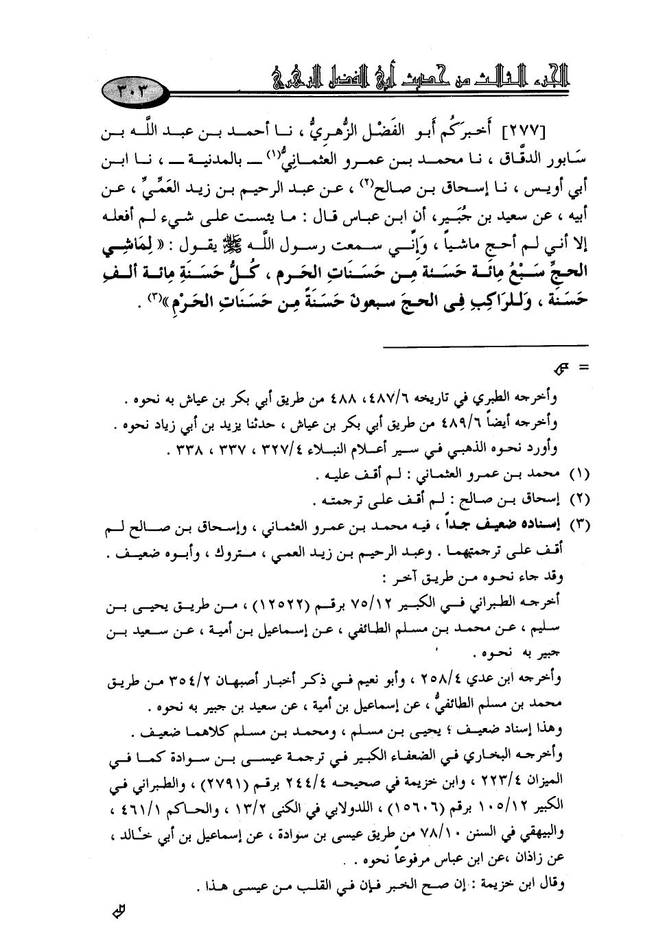 277 - أَخْبَرَكُمْ أَبُو الْفَضْلِ الزُّهْرِيُّ، نا أَحْمَدُ بْنُ عَبْدِ اللَّهِ بْنِ سَابُورَ الدَّقَّاقُ، نا مُحَمَّدُ بْنُ عَمْرٍو الْعُثْمَانِيُّ، بِالْمَدِينَةِ، نا ابْنُ أَبِي أُوَيْسٍ، نا إِسْحَاقُ بْنُ صَالِحٍ، عَنْ عَبْدِ الرَّحِيمِ بْنِ زَيْدٍ الْعَمِّيِّ، عَنْ أَبِيهِ، عَنْ سَعِيدِ بْنِ جُبَيْرٍ، أَنَّ ابْنَ عَبَّاسٍ قَالَ: مَا يَئِسْتُ عَلَى شَيْءٍ لَمْ أَفْعَلْهُ إِلَّا أَنِّي لَمْ أَحُجَّ مَاشِيًا، وَإِنِّي سَمِعْتُ رَسُولَ اللَّهِ صَلَّى اللَّهُ عَلَيْهِ وَسَلَّمَ يَقُولُ: «لِمَاشِي الْحَجِّ سَبْعُ مِائَةِ حَسَنَةٍ مِنْ حَسَنَاتِ الْحَرَمِ، كُلُّ حَسَنَةٍ مِائَةُ أَلْفِ حَسَنَةٍ، وَلِلرَّاكِبِ فِي الْحَجِّ سَبْعُونَ حَسَنَةً مِنْ حَسَنَاتِ الْحَرَمِ»