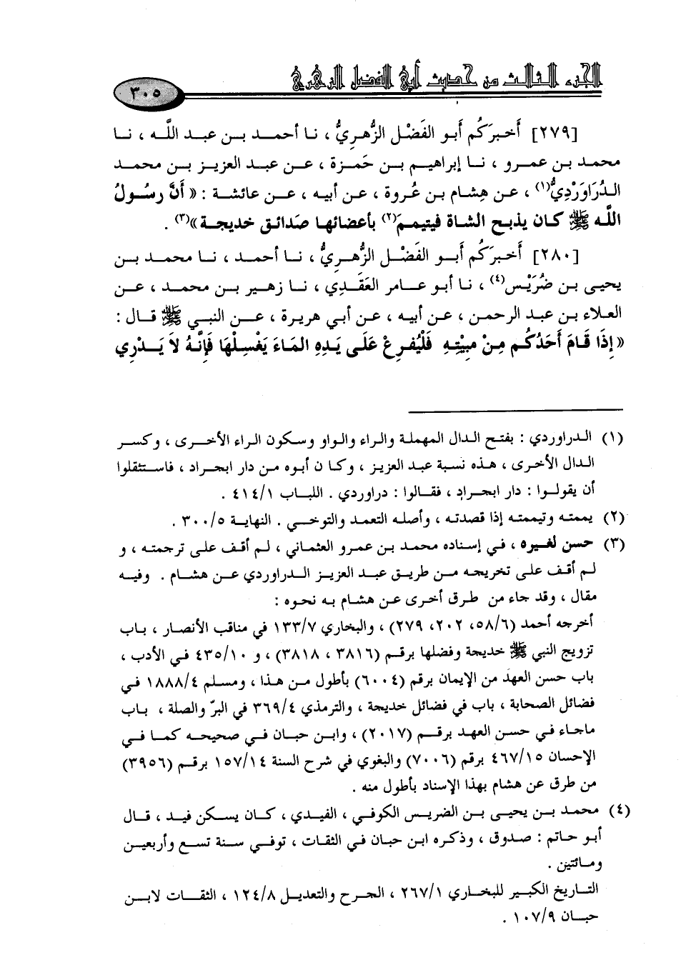 279 - أَخْبَرَكُمْ أَبُو الْفَضْلِ الزُّهْرِيُّ، نا أَحْمَدُ بْنُ عَبْدِ اللَّهِ، نا مُحَمَّدُ بْنُ عَمْرٍو، نا إِبْرَاهِيمُ بْنُ حَمْزَةَ، عَنْ عَبْدِ الْعَزِيزِ بْنِ مُحَمَّدٍ الدَّرَاوَرْدِيُّ، عَنْ هِشَامِ بْنِ عُرْوَةَ، عَنْ أَبِيهِ، عَنْ عَائِشَةَ: «أَنَّ رَسُولَ اللَّهِ صَلَّى اللَّهُ عَلَيْهِ وَسَلَّمَ كَانَ يَذْبَحُ الشَّاةَ فَيَتَيَمَّمُ بِأَعْضَائِهَا صَدَائِقَ خَدِيجَةَ»