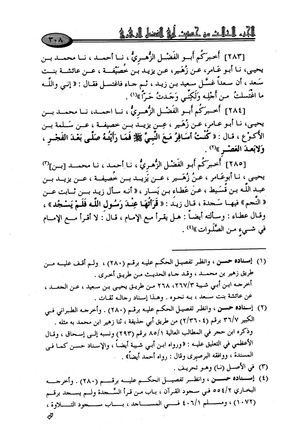 285 - أَخْبَرَكُمْ أَبُو الْفَضْلِ الزُّهْرِيُّ، نا أَحْمَدُ، نا مُحَمَّدُ بْنُ يَحْيَى، نا أَبُو عَامِرٍ، عَنْ زُهَيْرٍ، عَنْ يَزِيدَ بْنِ خُصَيْفَةَ، عَنْ يَزِيدَ بْنِ عَبْدِ اللَّهِ بْنِ قُسَيْطٍ، عَنْ عَطَاءِ بْنِ يَسَارٍ، أَنَّهُ سَأَلَ زَيْدَ بْنَ ثَابِتٍ عَنِ النَّجْمِ فِيهَا سَجْدَةٌ؟ قَالَ زَيْدٌ: «قَرَأْتُهَا عِنْدَ رَسُولِ اللَّهِ , فَلَمْ يَسْجُدْ» وَقَالَ عَطَاءٌ: وَسَأَلْتُهُ أَيْضًا: هَلْ يُقْرَأُ مَعَ الْإِمَامِ؟ قَالَ: لَا أَقْرَأُ مَعَ الْإِمَامِ فِي شَيْءٍ مِنَ الصَّلَوَاتِ