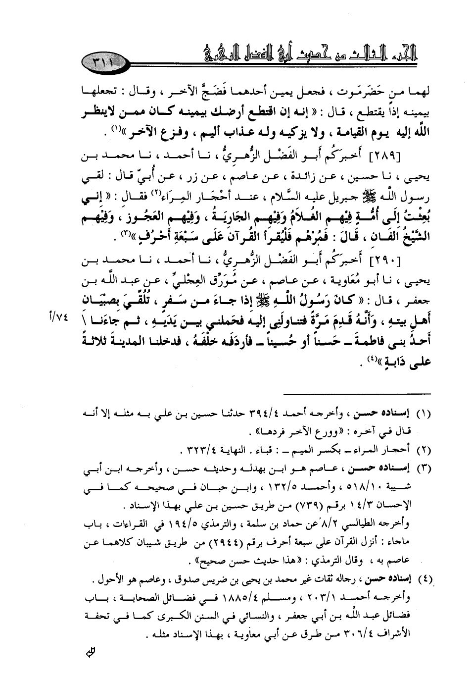 289 - أَخْبَرَكُمْ أَبُو الْفَضْلِ الزُّهْرِيُّ، نا أَحْمَدُ، نا مُحَمَّدُ بْنُ يَحْيَى، نا حُسَيْنٌ، عَنْ زَائِدَةَ، عَنْ عَاصِمٍ، عَنْ زِرٍّ، عَنْ أُبَيٍّ قَالَ،: لَقِيَ رَسُولُ اللَّهِ صَلَّى اللَّهُ عَلَيْهِ وَسَلَّمَ جِبْرِيلَ عَلَيْهِ السَّلَامُ عِنْدَ أَحْجَارِ الْمِرَاءِ , فَقَالَ: «إِنِّي بُعِثْتُ إِلَى أُمَّةٍ فِيهِمُ الْغُلَامُ , وَفِيهِمُ الْجَارِيَةُ، وَفِيهِمُ الْعَجُوزُ، وَفِيهِمُ الشَّيْخِ الْفَانِ» قَالَ: «فَمُرْهُمْ فَلْيُقْرَأِ الْقُرْآنُ عَلَى سَبْعَةِ أَحْرُفٍ»