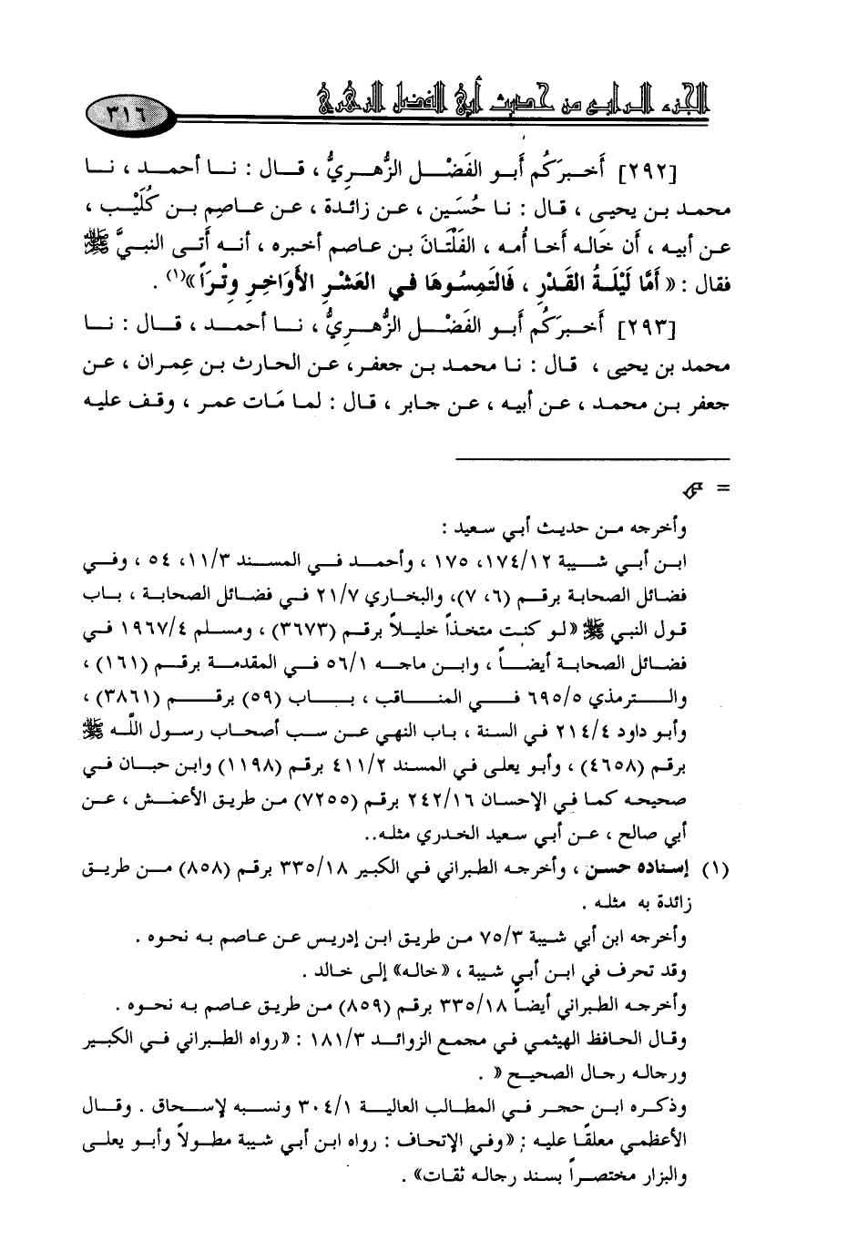 292 - أَخْبَرَكُمْ أَبُو الْفَضْلِ الزُّهْرِيُّ، نا أَحْمَدُ، نا مُحَمَّدُ بْنُ يَحْيَى، قَالَ: نا حُسَيْنٌ، عَنْ زَائِدَةَ، عَنْ عَاصِمِ بْنِ كُلَيْبٍ، عَنْ أَبِيهِ، أَنَّ خَالَهُ أَخَا أُمِّهِ الْفَلْتَانَ بْنَ عَاصِمٍ أَخْبَرَهُ، أَنَّهُ أَتَى النَّبِيَّ صَلَّى اللَّهُ عَلَيْهِ وَسَلَّمَ , فَقَالُ: «أَمَّا لَيْلَةُ الْقَدْرِ، فَالْتَمِسُوهَا فِي الْعَشْرِ الْأَوَاخِرِ وِتْرًا»