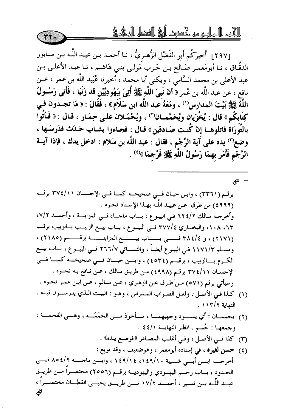297 - أَخْبَرَكُمْ أَبُو الْفَضْلِ الزُّهْرِيُّ، نا أَحْمَدُ بْنُ عَبْدِ اللَّهِ بْنِ سَابُورَ الدَّقَّاقُ، نا أَبُو مَعْمَرٍ صَالِحُ بْنُ حَرْبٍ مَوْلَى بَنِي هَاشِمٍ، نا عَبْدُ الْأَعْلَى بْنُ عَبْدِ الْأَعْلَى بْنِ مُحَمَّدٍ السَّامِيُّ وَيُكْنَى أَبَا مُحَمَّدٍ، أَخْبَرَنَا عُبَيْدُ اللَّهِ بْنُ عُمَرَ، عَنْ نَافِعٍ، عَنْ عَبْدِ اللَّهِ بْنِ عُمَرَ، أَنَّ نَبِيَّ اللَّهِ صَلَّى اللَّهُ عَلَيْهِ وَسَلَّمَ أُتِيَ بِيَهُودِيَّيْنِ قَدْ زَنَيَا، فَأَتَى رَسُولُ اللَّهِ صَلَّى اللَّهُ عَلَيْهِ وَسَلَّمَ بَيْتَ الْمُدَارَسِ، وَمَعَهُ عَبْدُ اللَّهِ بْنُ سَلَّامٍ، فَقَالَ: «مَا تَجِدُوا فِي كِتَابِكُمْ؟» قَالَ: يُخْزَيَانِ وَيُحَمَّمَانِ، وَيُحْمَلَانِ عَلَى حِمَارٍ، قَالَ: {فَأْتُوا بِالتَّوْرَاةِ , فَاتْلُوهَا إِنْ كُنْتُمْ صَادِقِينَ} [آل عمران: 93] قَالَ: فَجَاءُوا بِشَابٍّ حَدَثٍ , فَدَرَسَهَا، وَضَعَ يَدَهُ عَلَى آيَةِ الرَّجْمِ، فَقَالَ: عَبْدُ اللَّهِ بْنُ سَلَّامٍ: ادْخُلْ يَدَكَ، فَإِذَا آيَةُ الرَّجْمِ , فَأَمَرَ بِهِمَا رَسُولُ اللَّهِ صَلَّى اللَّهُ عَلَيْهِ وَسَلَّمَ , فَرُجِمَا قَالَ عَبْدُ اللَّهِ بْنُ عُمَرَ: كُنْتُ فِيمَنْ رَجَمَهُمَا