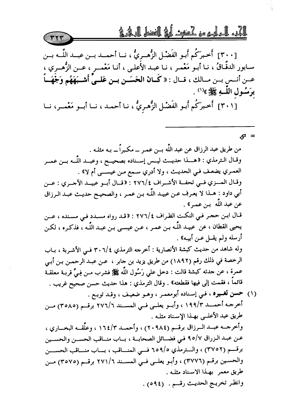 300 - أَخْبَرَكُمْ أَبُو الْفَضْلِ الزُّهْرِيُّ، نا أَحْمَدُ بْنُ عَبْدِ اللَّهِ بْنِ سَابُورَ الدَّقَّاقُ، نا أَبُو مَعْمَرٍ، نا عَبْدُ الْأَعْلَى، أنا مَعْمَرٌ، عَنِ الزُّهْرِيِّ، عَنْ أَنَسِ بْنِ مَالِكٍ، قَالَ: «كَانَ الْحَسَنُ بْنُ عَلِيٍّ أَشْبَهَهُمْ وَجْهًا بِرَسُولِ اللَّهِ صَلَّى اللَّهُ عَلَيْهِ وَسَلَّمَ»