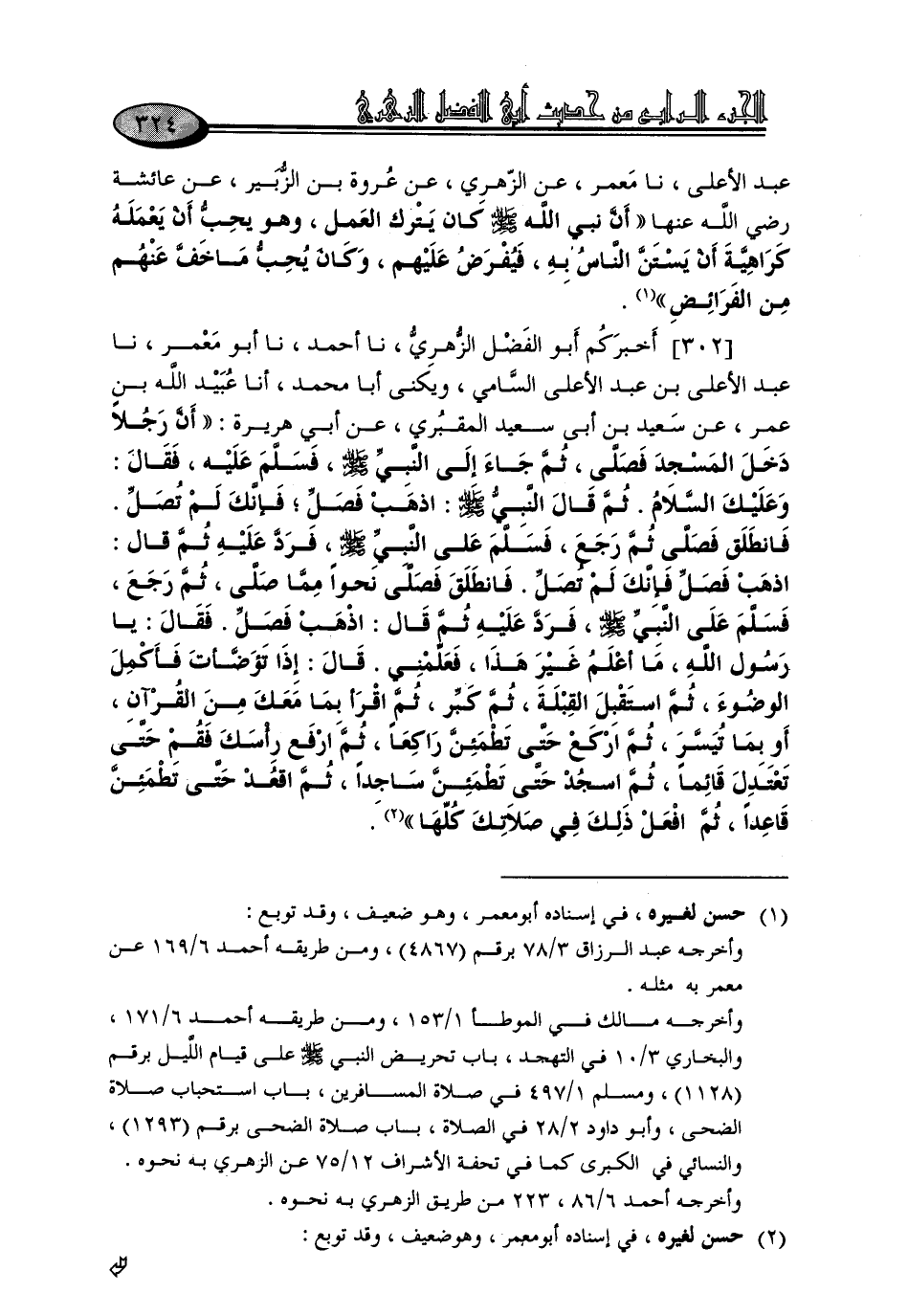 302 - أَخْبَرَكُمْ أَبُو الْفَضْلِ الزُّهْرِيُّ، نا أَحْمَدُ، نا أَبُو مَعْمَرٍ، نا عَبْدُ الْأَعْلَى بْنُ عَبْدِ الْأَعْلَى السَّامِيُّ وَيُكْنَى أَبَا مُحَمَّدٍ، أنا عُبَيْدُ اللَّهِ بْنُ عُمَرَ، عَنْ سَعِيدِ بْنِ أَبِي سَعِيدٍ الْمَقْبُرِيِّ، عَنْ أَبِي هُرَيْرَةَ، أَنَّ رَجُلًا، دَخَلَ الْمَسْجِدَ فَصَلَّى، ثُمَّ جَاءَ إِلَى النَّبِيِّ صَلَّى اللَّهُ عَلَيْهِ وَسَلَّمَ، فَسَلَّمَ عَلَيْهِ، فَقَالَ: «وَعَلَيْكَ السَّلَامُ». ثُمَّ قَالَ النَّبِيُّ صَلَّى اللَّهُ عَلَيْهِ وَسَلَّمَ: «اذْهَبْ فَصَلِّ؛ فَإِنَّكَ لَمْ تُصَلِّ» , فَانْطَلَقَ فَصَلَّى , ثُمَّ رَجَعَ، فَسَلَّمَ عَلَى النَّبِيِّ صَلَّى اللَّهُ عَلَيْهِ وَسَلَّمَ، فَرَدَّ عَلَيْهِ , ثُمَّ قَالَ: «اذْهَبْ فَصَلِّ؛ فَإِنَّكَ لَمْ تُصَلِّ» , فَانْطَلَقَ فَصَلَّى نَحْوًا مِمَّا صَلَّى، ثُمَّ رَجَعَ، فَسَلَّمَ عَلَى النَّبِيِّ صَلَّى اللَّهُ عَلَيْهِ وَسَلَّمَ، فَرَدَّ عَلَيْهِ , ثُمَّ قَالَ: «اذْهَبْ فَصَلِّ» , فَقَالَ: يَا رَسُولَ اللَّهِ، مَا أَعْلَمُ غَيْرَ هَذَا، فَعَلِّمْنِي - قَالَ: «إِذَا تَوَضَّأْتَ , فَأَكْمِلِ الْوُضُوءَ، ثُمَّ اسْتَقْبِلِ الْقِبْلَةَ، ثُمَّ كَبِّرْ، ثُمَّ اقْرَأْ بِمَا مَعَكَ مِنَ الْقُرْآنِ»، أَوْ «بِمَا تَيَسَّرَ، ثُمَّ ارْكَعْ حَتَّى تَطْمَئِنَّ رَاكِعًا، ثُمَّ ارْفَعْ رَأْسَكَ , فَقُمْ حَتَّى تَعْتَدِلَ قَائِمًا، ثُمَّ اسْجُدْ حَتَّى تَطْمَئِنَّ سَاجِدًا، ثُمَّ اقْعُدْ حَتَّى تَطْمَئِنَّ قَاعِدًا، ثُمَّ افْعَلْ ذَلِكَ فِي صَلَاتِكَ كُلِّهَا»