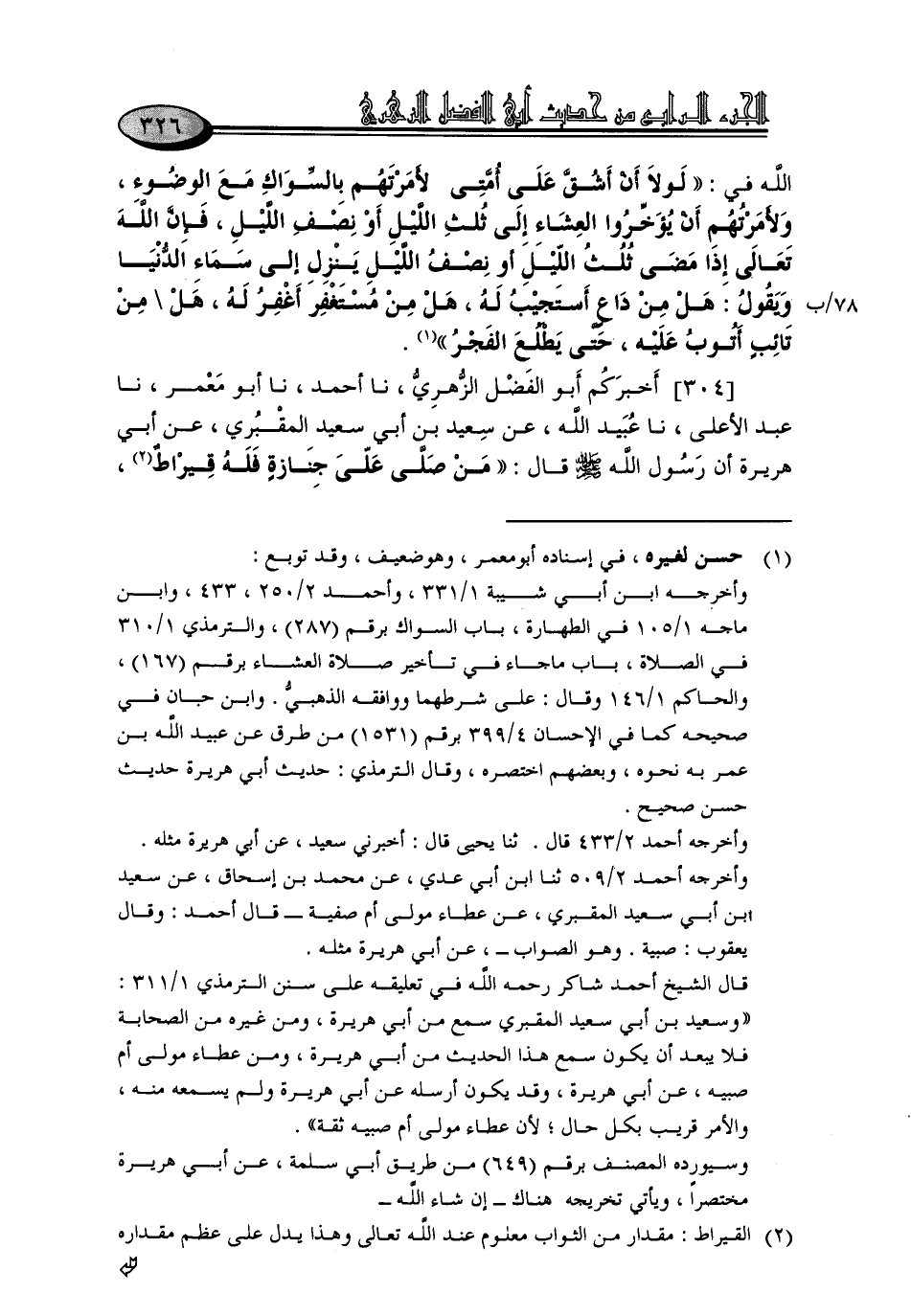 304 - أَخْبَرَكُمْ أَبُو الْفَضْلِ الزُّهْرِيُّ، نا أَحْمَدُ، نا أَبُو مَعْمَرٍ، نا عَبْدُ الْأَعْلَى، نا عُبَيْدُ اللَّهِ، عَنْ سَعِيدِ بْنِ أَبِي سَعِيدٍ الْمَقْبُرِيِّ، عَنْ أَبِي هُرَيْرَةَ، أَنَّ رَسُولَ اللَّهِ صَلَّى اللَّهُ عَلَيْهِ وَسَلَّمَ قَالَ: «مَنْ صَلَّى عَلَى جِنَازَةٍ فَلَهُ قِيرَاطٌ، -[327]- وَمَنِ انْتَظَرَ دَفْنَهَا فَلَهُ قِيرَاطَانِ»