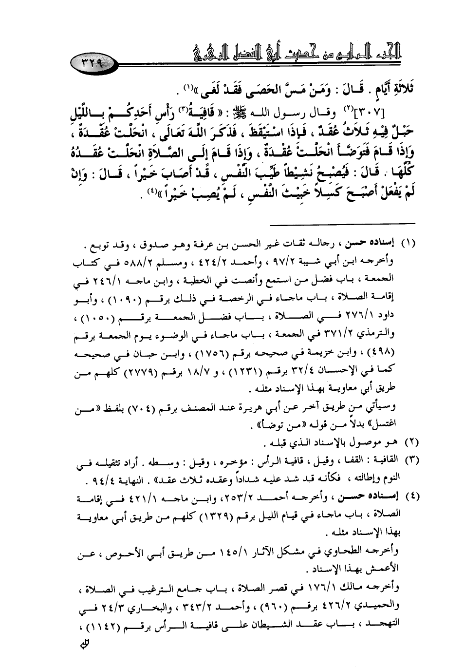 307 - وَقَالَ رَسُولُ اللَّهِ صَلَّى اللَّهُ عَلَيْهِ وَسَلَّمَ: «قَافِيَةُ رَأْسِ أَحَدِكُمْ بِاللَّيْلِ حَبْلٌ فِيهِ ثَلَاثُ عُقَدٍ، فَإِذَا اسْتَيْقَظَ، فَذَكَرَ اللَّهَ تَعَالَى، انْحَلَّتْ عُقْدَةٌ، وَإِذَا قَامَ فَتَوَضَّأَ انْحَلَّتْ عُقْدَةٌ، وَإِذَا قَامَ إِلَى الصَّلَاةِ انْحَلَّتْ عُقْدُهُ كُلُّهَا». قَالَ: «فَيُصْبِحُ نَشِيطًا طَيِّبَ النَّفْسِ، قَدْ أَصَابَ خَيْرًا». قَالَ: «وَإِنْ لَمْ يَفْعَلْ أَصْبَحَ كَسِلًا خَبِيثَ النَّفْسِ، لَمْ يُصِبْ خَيْرًا»