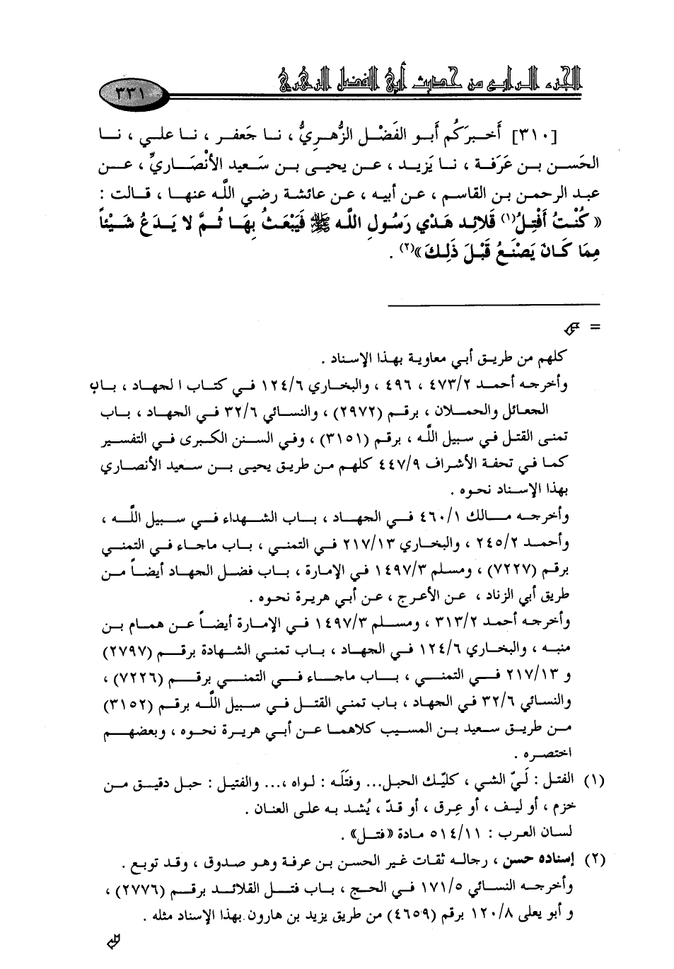 310 - أَخْبَرَكُمْ أَبُو الْفَضْلِ الزُّهْرِيُّ، نا جَعْفَرٌ، نا عَلِيٌّ، نا الْحَسَنُ بْنُ عَرَفَةَ، نا يَزِيدُ، عَنْ يَحْيَى بْنِ سَعِيدٍ الْأَنْصَارِيِّ، عَنْ عَبْدِ الرَّحْمَنِ بْنِ الْقَاسِمِ، عَنْ أَبِيهِ، عَنْ عَائِشَةَ، رَضِيَ اللَّهُ عَنْهَا، قَالَتْ: «كُنْتُ أَفْتِلُ قَلَائِدَ هَدْيِ رَسُولِ اللَّهِ صَلَّى اللَّهُ عَلَيْهِ وَسَلَّمَ , فَيَبْعَثُ بِهَا , ثُمَّ لَا يَدَعُ شَيْئًا مِمَّا كَانَ يَصْنَعُ قَبْلَ ذَلِكَ»