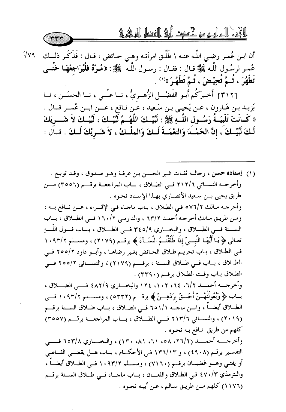312 - أَخْبَرَكُمْ أَبُو الْفَضْلِ الزُّهْرِيُّ، نا عَلِيٌّ، نا الْحَسَنُ، نا يَزِيدُ بْنُ هَارُونَ، عَنْ يَحْيَى بْنِ سَعِيدٍ، عَنْ نَافِعٍ، عَنِ ابْنِ عُمَرَ، قَالَ: كَانَتْ تَلْبِيَةُ رَسُولِ اللَّهِ صَلَّى اللَّهُ عَلَيْهِ وَسَلَّمَ: لَبَّيْكَ اللَّهُمَّ لَبَّيْكَ، لَبَّيْكَ لَا شَرِيكُ لَكَ لَبَّيْكَ، إِنَّ الْحَمْدَ وَالنِّعْمَةَ لَكَ وَالْمُلْكَ، لَا شَرِيكَ لَكَ قَالَ: -[334]- وَكَانَ ابْنُ عُمَرَ يَزِيدُ عَلَى هَؤُلَاءِ الْكَلِمَاتِ: لَبَّيْكَ وَالرَّغْبَاءُ إِلَيْكَ وَالْعَمَلُ، لَبَّيْكَ لَبَّيْكَ