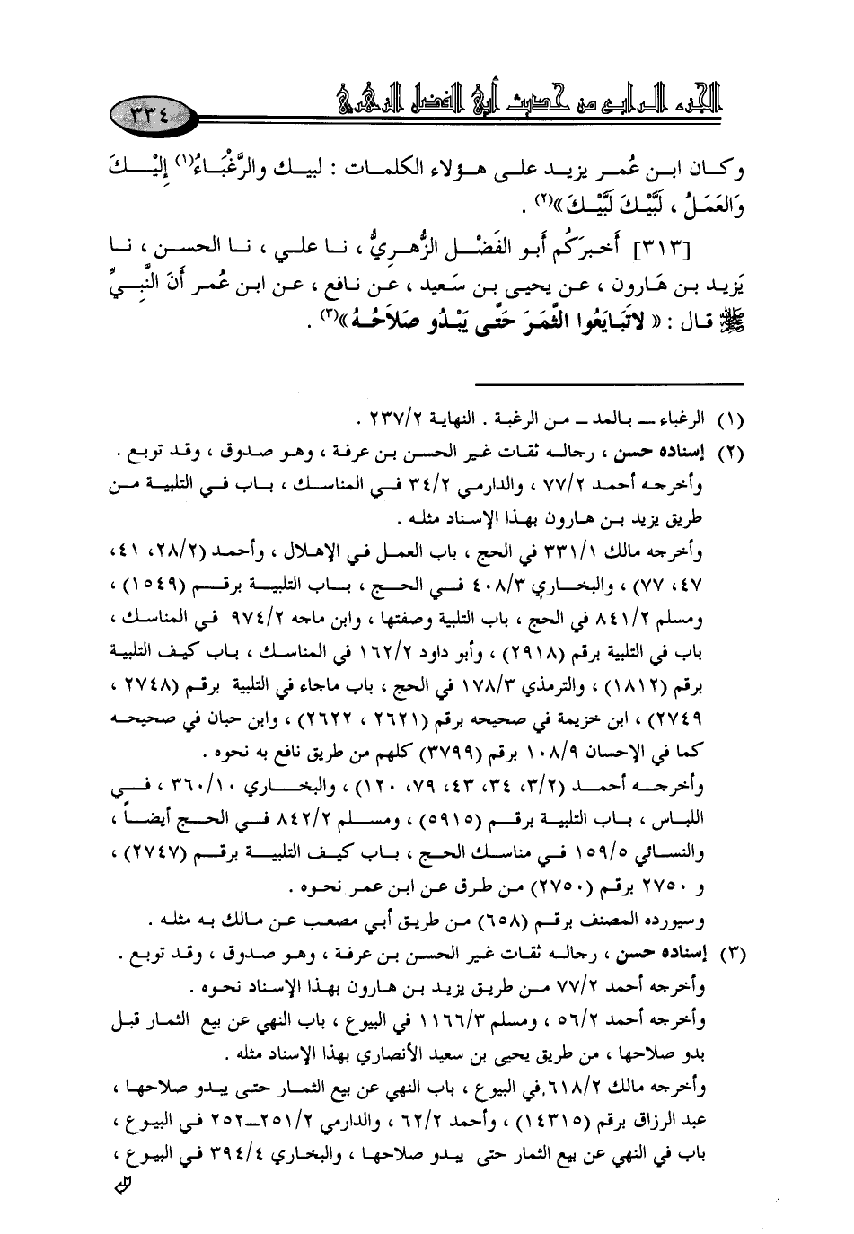 313 - أَخْبَرَكُمْ أَبُو الْفَضْلِ الزُّهْرِيُّ، نا عَلِيٌّ، نا الْحَسَنُ، نا يَزِيدُ بْنُ هَارُونَ، عَنْ يَحْيَى بْنِ سَعِيدٍ، عَنْ نَافِعٍ، عَنِ ابْنِ عُمَرَ، أَنَّ النَّبِيَّ صَلَّى اللَّهُ عَلَيْهِ وَسَلَّمَ قَالَ: «لَا تَبَايَعُوا الثَّمَرَ حَتَّى يَبْدُو صَلَاحُهُ»