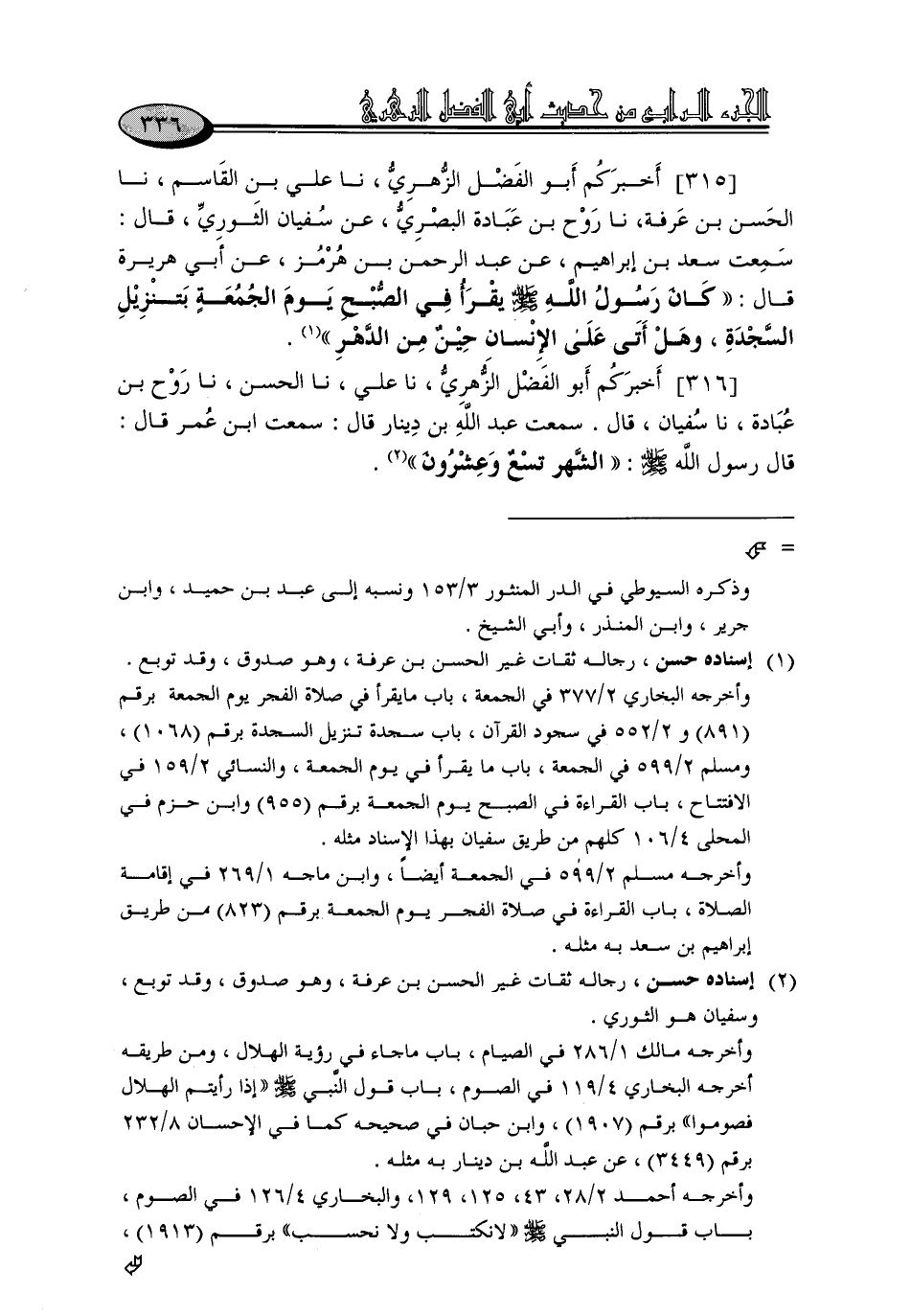 315 - أَخْبَرَكُمْ أَبُو الْفَضْلِ الزُّهْرِيُّ، نا عَلِيُّ بْنُ الْقَاسِمِ، نا الْحَسَنُ بْنُ عَرَفَةَ، نا رَوْحُ بْنُ عُبَادَةَ الْبَصْرِيُّ، عَنْ سُفْيَانَ الثَّوْرِيِّ، قَالَ: سَمِعْتُ سَعْدَ بْنَ إِبْرَاهِيمَ، عَنْ عَبْدِ الرَّحْمَنِ بْنِ هُرْمُزَ، عَنْ أَبِي هُرَيْرَةَ، قَالَ: «كَانَ رَسُولُ اللَّهِ صَلَّى اللَّهُ عَلَيْهِ وَسَلَّمَ يَقْرَأُ فِي الصُّبْحِ يَوْمَ الْجُمُعَةِ بِتَنْزِيلِ السَّجْدَةِ، وَهَلْ أَتَى عَلَى الْإِنْسَانِ حِينٌ مِنَ الدَّهْرِ»