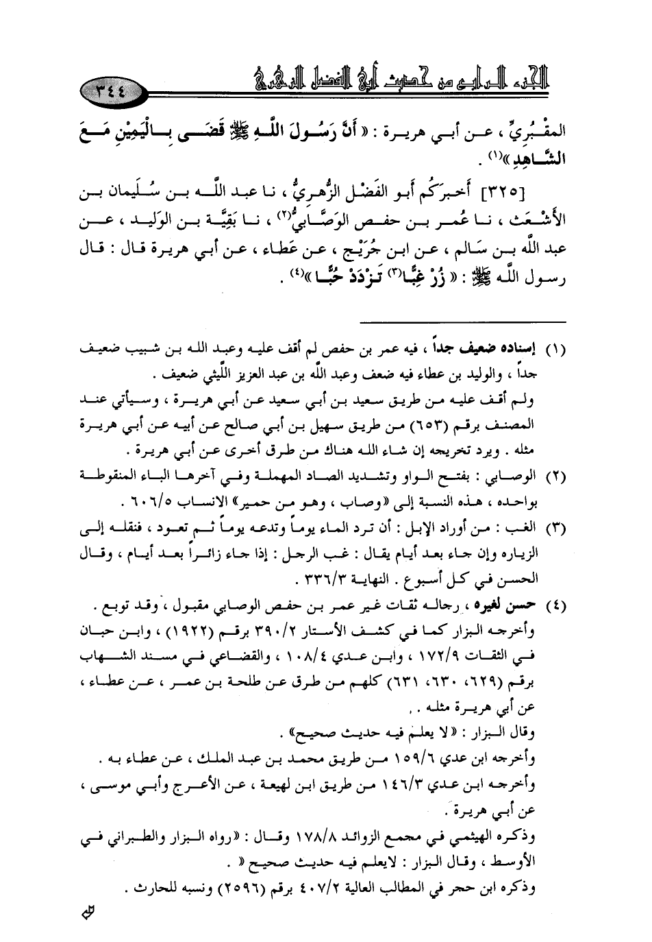325 - أَخْبَرَكُمْ أَبُو الْفَضْلِ الزُّهْرِيُّ، نا عَبْدُ اللَّهِ بْنُ سُلَيْمَانَ بْنِ الْأَشْعَثَ، نا عُمَرُ بْنُ حَفْصٍ الْوَصَّابِيُّ، نا بَقِيَّةُ بْنُ الْوَلِيدِ، عَنْ عَبْدِ اللَّهِ بْنِ سَالِمٍ، عَنِ ابْنِ جُرَيْجٍ، عَنْ عَطَاءٍ، عَنْ أَبِي هُرَيْرَةَ، قَالَ: قَالَ رَسُولُ اللَّهِ صَلَّى اللَّهُ عَلَيْهِ وَسَلَّمَ: «زُرْ غِبًّا تَزْدَدْ حُبًّا»